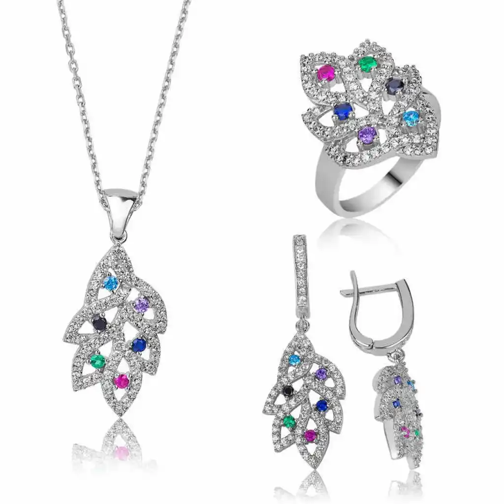 Kalbimizin ve ruhumuzun en eğlenceli tarafı olan rengarenk hayal dünyamızın yansıması özel tasarım renkli setler... Bu şık set; doğum günü hediyesi, sevgililer günü hediyesi veya annelere hediye olarak özel günlerde tercih edilebilecek mükemmel bir seçenektir. Renkli bayan set 925 ayar gümüşten üretilmiştir. Gümüş setin zincir uzunluğu 45 cm’dir. Gümüş üzerine rodyum kaplama yapılmıştır. Rodyum kaplama yapılan bayan setler parlaklığını uzun süre muhafaza eder ve oksitlenmeyi geciktirir. Tüm gümüş setlerde olduğu gibi gümüş renkli bayan set de el emeği ile üretilmiştir. Gümüş ve değerli taşlar nedeniyle belirtilen ortalama ürün ağırlığında ± %10 sapma olabilmektedir.