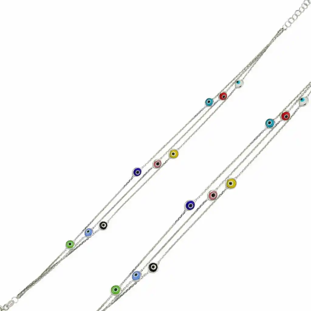 Nazar boncuğunu insanlar uzun yıllardan beri kötü bakıştan korunmak için kullanmışlardır. Kötü bakışların insanlar üzerinde olumsuz etki oluşturmasına karşı bir önlemdir nazar boncuğu… Bu sebeptendir ki insanlar sevdiklerini korumak için nazar boncuğu takmaktadır. Bu nazar bileklik de şıklığı ve zarafeti yansıtıyor. Rengarenk tasarımıyla göz alıcı şıklıkta... Her dönem sevilen ve şıklığından ödün vermeyen bu modeli; doğum günü hediyesi, sevgililer günü hediyesi veya annelere hediye olarak özel günlerde tercih edebilirsiniz. Renkli nazar bayan bileklik, 925 ayar gümüşten imal edilmiştir. Gümüş üzerine rodyum kaplama yapılmıştır. Rodyum kaplama yapılan gümüş bayan bileklikler parlaklığını uzun süre muhafaza eder, oksitlenmesi gecikir. Üzerinde bulunan taşlar camdır. Tüm gümüş bayan bilekliklerinde olduğu gibi bu gümüş renkli nazar bayan bileklik de tamamı el emeği ile üretilmiştir. Gümüş ve değerli taşlar nedeniyle belirtilen ortalama ürün ağırlığında ± %10 sapma olabilmektedir.