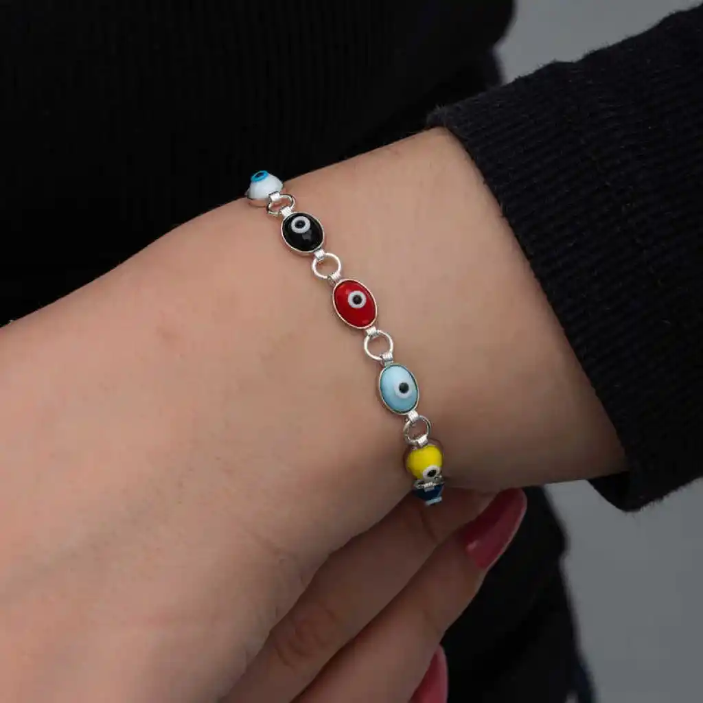 Nazar boncuğunu insanlar uzun yıllardan beri kötü bakıştan korunmak için kullanmışlardır. Kötü bakışların insanlar üzerinde olumsuz etki oluşturmasına karşı bir önlemdir nazar boncuğu… Bu sebeptendir ki insanlar sevdiklerini korumak için nazar boncuğu takmaktadır. Bu nazar bileklik de şıklığı ve zarafeti yansıtıyor. Rengarenk tasarımıyla göz alıcı şıklıkta... Her dönem sevilen ve şıklığından ödün vermeyen bu modeli; doğum günü hediyesi, sevgililer günü hediyesi veya annelere hediye olarak özel günlerde tercih edebilirsiniz. Renkli nazar kadın bileklik, 925 ayar gümüşten imal edilmiştir. Gümüş üzerine rodyum kaplama yapılmıştır. Rodyum kaplama yapılan gümüş kadın bileklikler parlaklığını uzun süre muhafaza eder, oksitlenmesi gecikir. Tüm gümüş kadın bilekliklerinde olduğu gibi bu gümüş renkli nazar kadın bileklik de tamamı el emeği ile üretilmiştir. Gümüş ve değerli taşlar nedeniyle belirtilen ortalama ürün ağırlığında ± %10 sapma olabilmektedir.