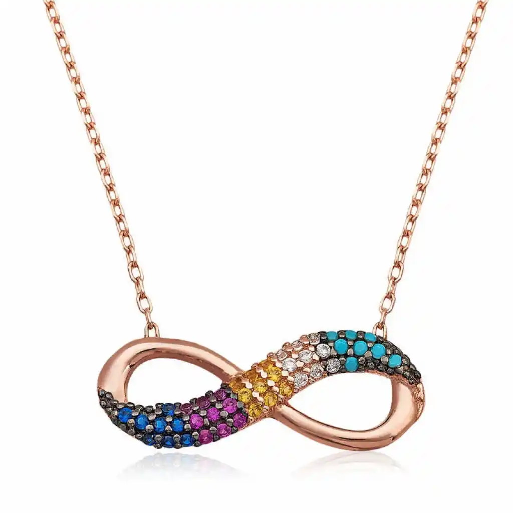 Sevgilinize sonsuz aşkı ifade etmenin en güzel en anlamlı yollarından biri de sonsuzluk kolyesidir. Sevgilinize hediye edeceğiniz bu özel kolye ile ona olan sonsuz aşkınızı sevginizi ifade edebilir sonsuza kadar birlikte olacağınız mesajı verebilirsiniz. Gümüş üzerine rose altın kaplama yapılmıştır. Rose altın kaplama yapılan gümüş bayan kolye modelleri parlaklığını uzun süre muhafaza eder. Rose kaplama; ürüne pembe rengi verir ve oksitlenmesini geciktirir. Gümüş olan zincir boyu ortalama 45 cm'dir. Tüm gümüş bayan kolye modellerinde olduğu gibi gümüş sonsuzluk bayan kolye modeli de el emeği ile üretilmiştir. Gümüş ve değerli taşlar nedeniyle belirtilen ortalama ürün ağırlığında ± %10 sapma olabilmektedir.