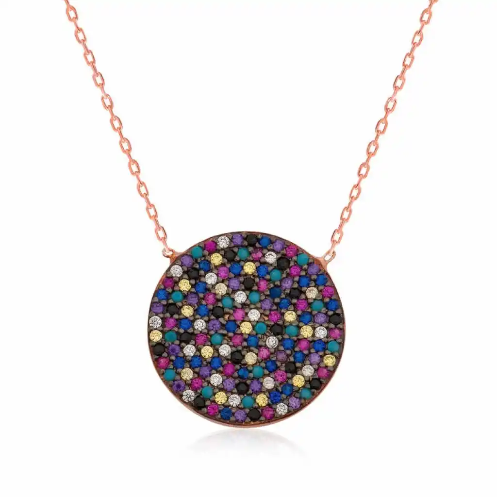 Kalbimizin ve ruhumuzun en eğlenceli tarafı olan rengarenk hayal dünyamızın yansıması özel tasarım renkli kolyeler... Bu şık kolyeyi doğum günü hediyesi, sevgililer günü hediyesi veya annelere hediye olarak özel günlerde tercih edilebilecek mükemmel bir seçenektir. Renkli bayan kolye 925 ayar gümüşten üretilmiştir. Gümüş kolyenin zincir uzunluğu 45 cm’dir. Gümüş üzerine rose kaplama yapılmıştır. Rose kaplama yapılan bayan kolyeler parlaklığını uzun süre muhafaza eder, gümüş rengini pembe renge dönüştürür ve oksitlenmeyi geciktirir. Tüm gümüş kolyelerde olduğu gibi gümüş renkli bayan kolye de el emeği ile üretilmiştir. Gümüş ve değerli taşlar nedeniyle belirtilen ürün ağırlığında ± %10 sapma olabilmektedir.