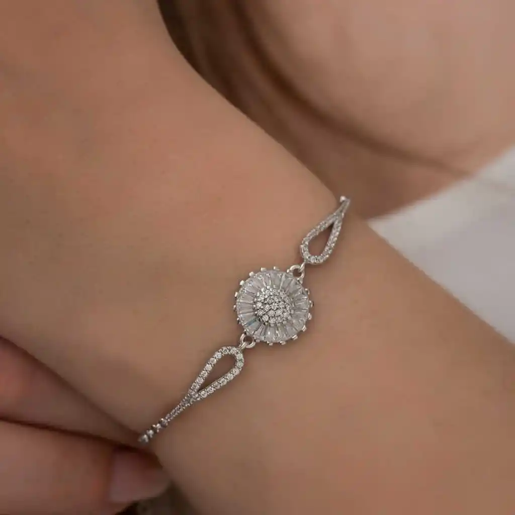Modaya uyumlu şekilde tasarlanan gümüş bileklik modellerini hem gündelik yaşantınızda hem özel gün ve gecelerinizde şık bir şekilde kullanabilirsiniz. Yenilikçi her yaştan kadının beğenisine hitap eden ürünlerle kombinlerinizi tamamlayabilirsiniz. Her biri farklı bir stile hitap edebilen tasarımlarla sizler de spor, klasik ve alternatif giyim tarzlarınıza uygun modellerimizi tercih edebilirsiniz. Bu şık baget taşlı bileklik; doğum günü hediyesi, sevgililer günü hediyesi veya özel günlerde tercih edilebilecek mükemmel bir seçenektir. Gümüş baget ve zirkon taşlı bayan bileklik 925 ayar gümüşten imal edilmiştir. Bu bileklik üzerine rodyum kaplama yapılmıştır. Rodyum kaplama yapılan ürünler parlaklığını uzun süre muhafaza eder, oksitlenmesini geciktirir. Tüm gümüş bayan bileklik modellerinde olduğu gibi gümüş baget taşlı bayan bileklik modeli de el emeği ile üretilmiştir. Gümüş ve değerli taşlar nedeniyle belirtilen ortalama ürün ağırlığında ± %10 sapma olabilmektedir.