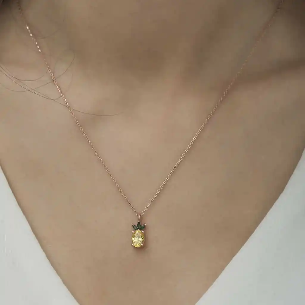 Yaz sezonunun en çok tercih edilen aksesuarları, renkli meyve konseptiyle favorileriniz arasında yer alacak. Meyve konsepti aksesuarlar yazın çok konuşulan kolyeleri olacak ve günlük stilinize renk katacak. Bu şık ananas figür kolye; doğum günü hediyesi, sevgililer günü hediyesi veya özel günlerde tercih edilebilecek mükemmel bir seçenektir. Gümüş zirkon taşlı ananas figür meyve kolye 925 ayar gümüşten imal edilmiştir. Bu kolye üzerine rose kaplama yapılmıştır. Rose kaplama yapılan ürünler parlaklığını uzun süre muhafaza eder, oksitlenmesini geciktirir. Tüm gümüş bayan kolye modellerinde olduğu gibi gümüş ananas figürlü meyve kolye modeli de el emeği ile üretilmiştir. Gümüş ve değerli taşlar nedeniyle belirtilen ortalama ürün ağırlığında ± %10 sapma olabilmektedir.