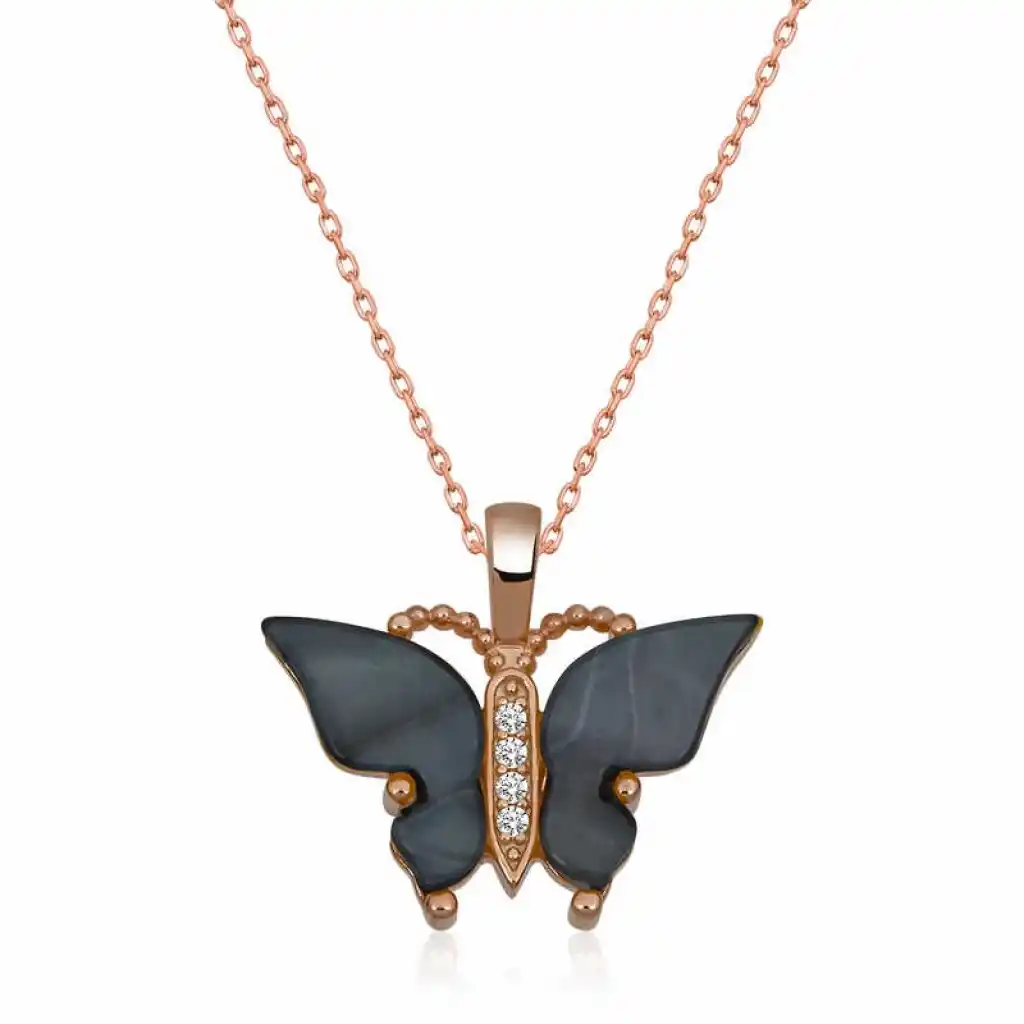 Gümüş Rose Antrasit Kaplangözü Taşlı Kelebek Bayan Kolye