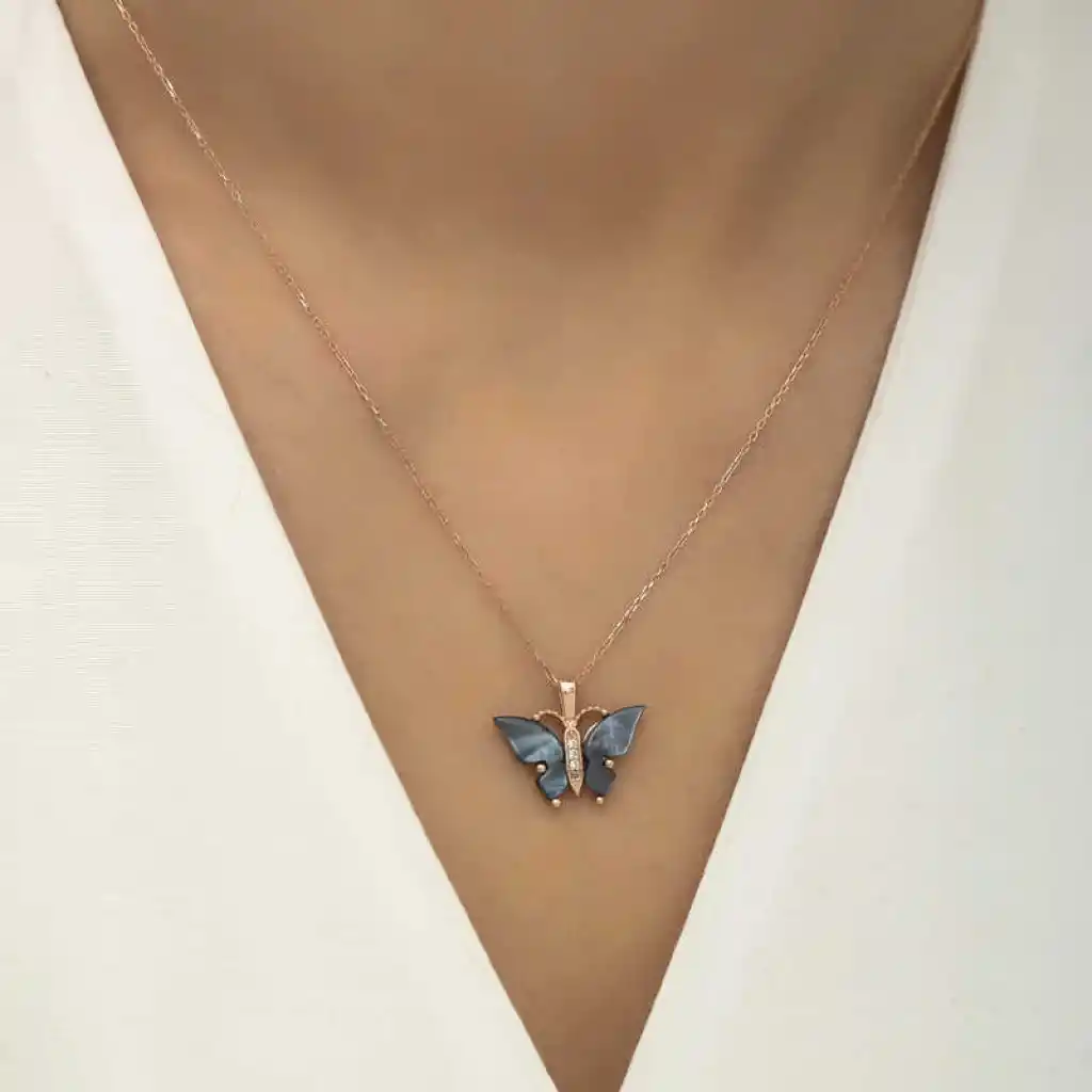 Gümüş Rose Antrasit Kaplangözü Taşlı Kelebek Bayan Kolye