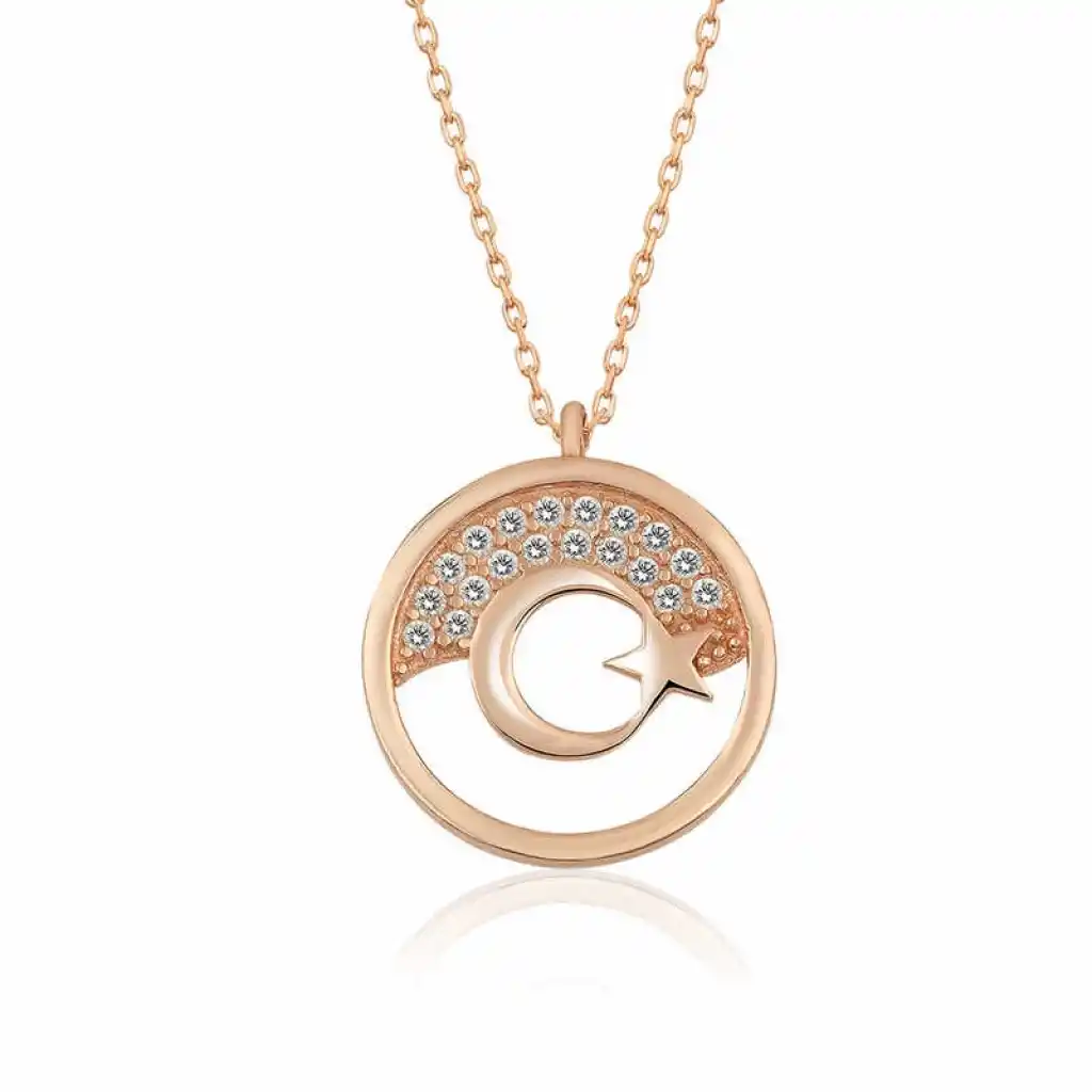 Türk Bayrağının rengini şehitlerin kanından, ilhamını da kan gölüne yansıyan ay ve yıldızdan aldığını biliyoruz. Bayrağın taşıdığı kutsal anlamı teninizde taşımak ve sevdiklerinizle paylaşmak için kaçırılmayacak bir fırsat. Ay yıldız kolye 925 ayar gümüşten imal edilmiştir. Gümüş üzerine rose kaplama yapılmıştır. Rose kaplama yapılan kolye modelleri parlaklığını uzun süre muhafaza eder ve oksitlenmesi gecikir. Tüm kolye modellerinde olduğu gibi rose ay yıldız bayan kolye de el emeği ile üretilmiştir. Üzerindeki taşlar zirkondur. Gümüş ve değerli taşlar nedeniyle belirtilen ortalama ürün ağırlığında ± %10 sapma olabilmektedir.