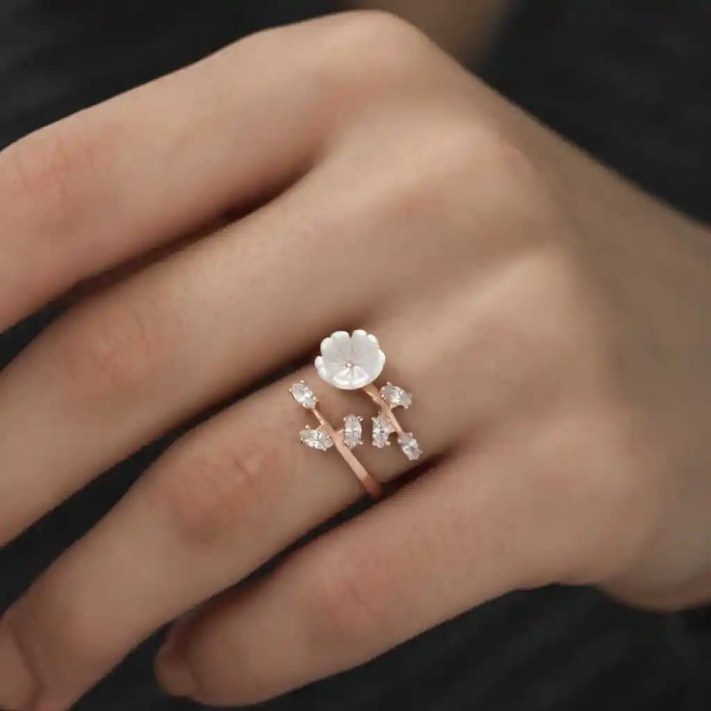 Gümüş Rose Beyaz Bahar Çiçeği Yüzük