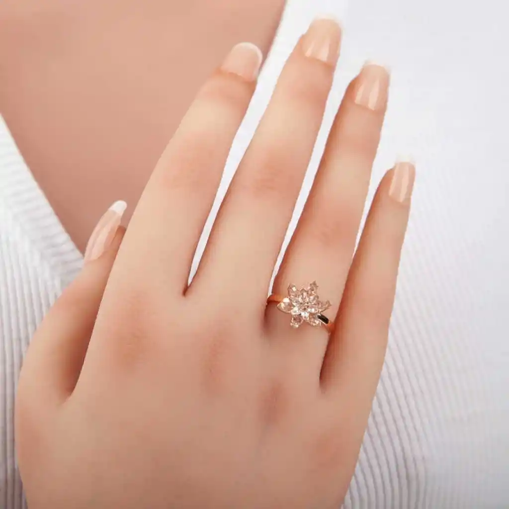 Gümüş Rose Ayarlanabilen Beyaz Taşlı Lotus Çiçeği Kadın Yüzük