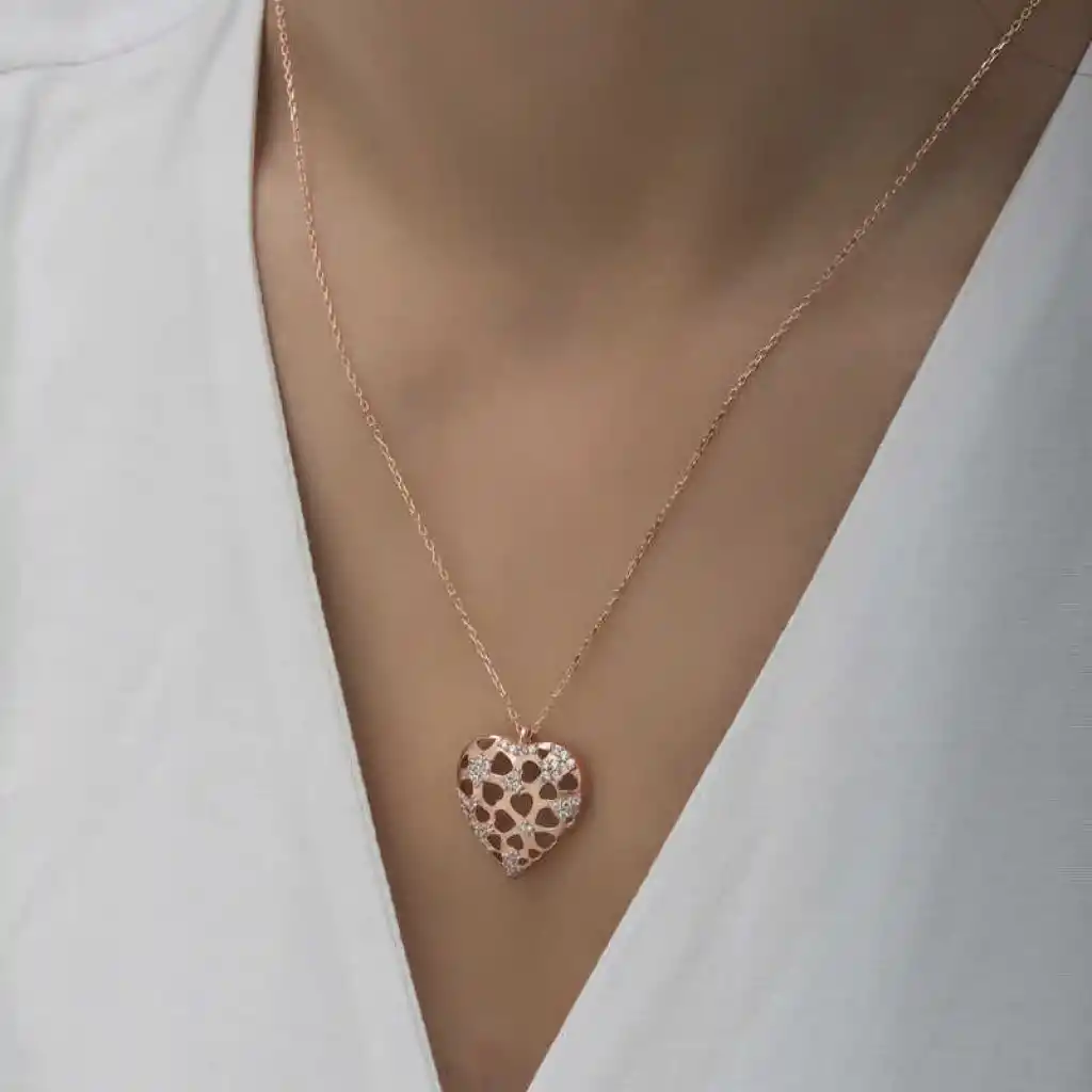 Kalp simgesi daima koşulsuz sevginin ve aşkın sembolü olmuştur. Dini öğretilerde ise kalbin gücü sınırsızdır. Çünkü kalp Yaradanın evi, bizim ise evrene açılan gerçeklik kapımızdır. Bu şık gümüş bombeli kalp kadın kolye; doğum günü hediyesi, sevgililer günü hediyesi veya annelere hediye olarak özel günlerde tercih edilebilecek mükemmel bir seçenektir. Gümüş kalp kadın kolye 925 ayar gümüşten imal edilmiştir. Bu kolye üzerinde rose kaplama yapılmıştır. Rose kaplama yapılan gümüş kadın kolye modelleri parlaklığını uzun süre muhafaza eder. Üzerinde bulunan taşlar zirkondur. Tüm gümüş kadın kolye modellerimizde olduğu gibi gümüş bombeli kalp kadın kolye modeli de el emeği ile üretilmiştir. Gümüş ve değerli taşlar nedeniyle belirtilen ortalama ürün ağırlığında ± %10 sapma olabilmektedir.