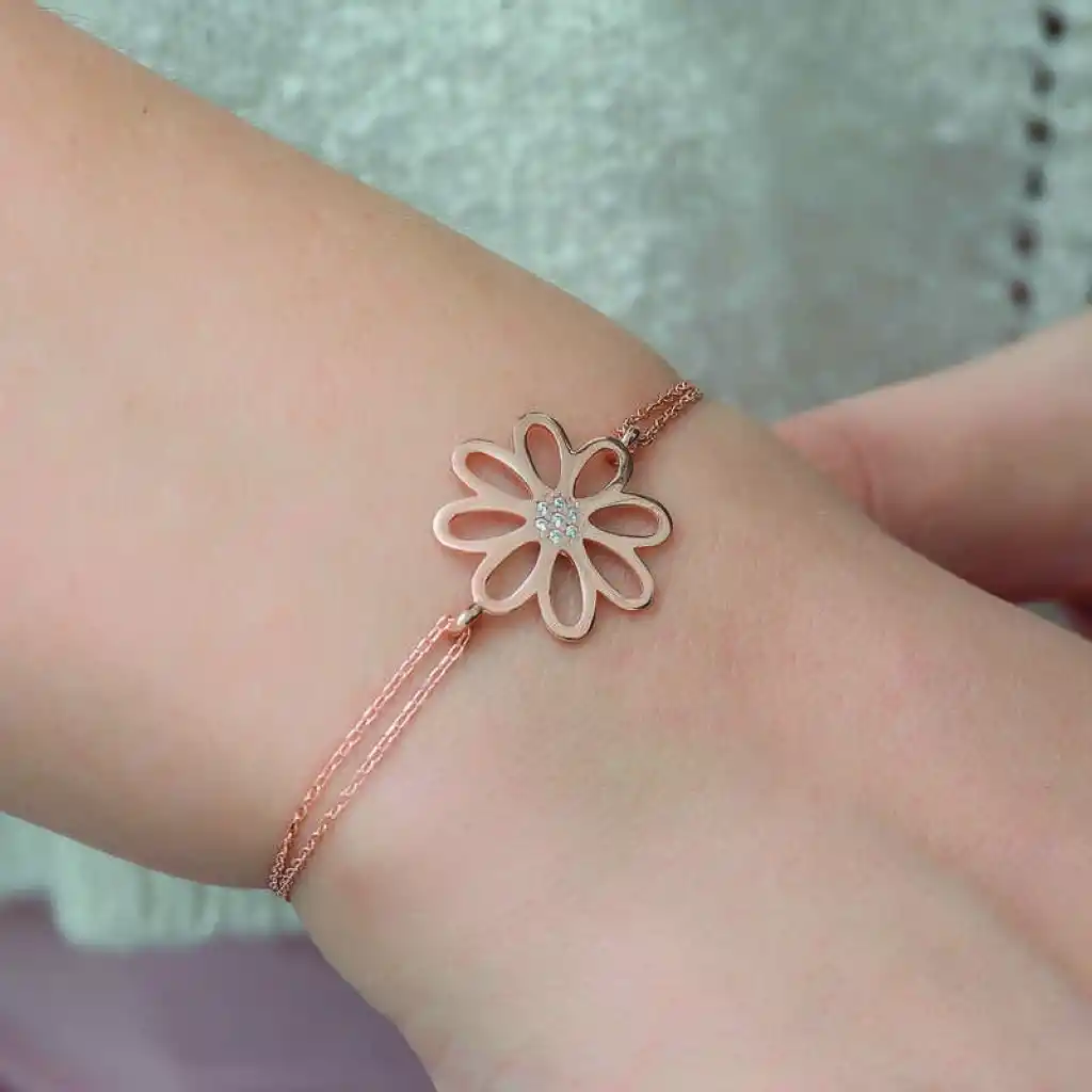 Sevdiklerinize duygularınızı ifade etmenin yolu neden çiçek desenli zarif bir bileklik olmasın? Özel zamanlarda O’na gönderebileceğiniz, hediye seçenekleri arasında yer alan bu şık bileklik sevdiklerinizi sevindirmenin en güzel yolları arasında yer almaktadır. En kaliteli, en ışıltılı taşlarla hazırlanmış gümüş çiçek bayan bileklik; sevgisini bir kez daha anlatmak isteyenleri, sen bir çiçeksin demek isteyenleri bekliyor. Bu özel tasarım gümüş çiçek bayan bileklik 925 ayar gümüşten imal edilmiştir. Gümüş üzerine rose altın kaplama yapılmıştır. Rose altın kaplama yapılan gümüş bayan bileklik modelleri parlaklığını uzun süre muhafaza eder ve oksitlenmesi gecikir. Tüm bayan gümüş bileklik modellerinde olduğu gibi gümüş rose çiçek bayan bileklik de el emeği ile üretilmiştir. Gümüş ve değerli taşlar nedeniyle belirtilen ürün ağırlığında ± %10 sapma olabilmektedir.