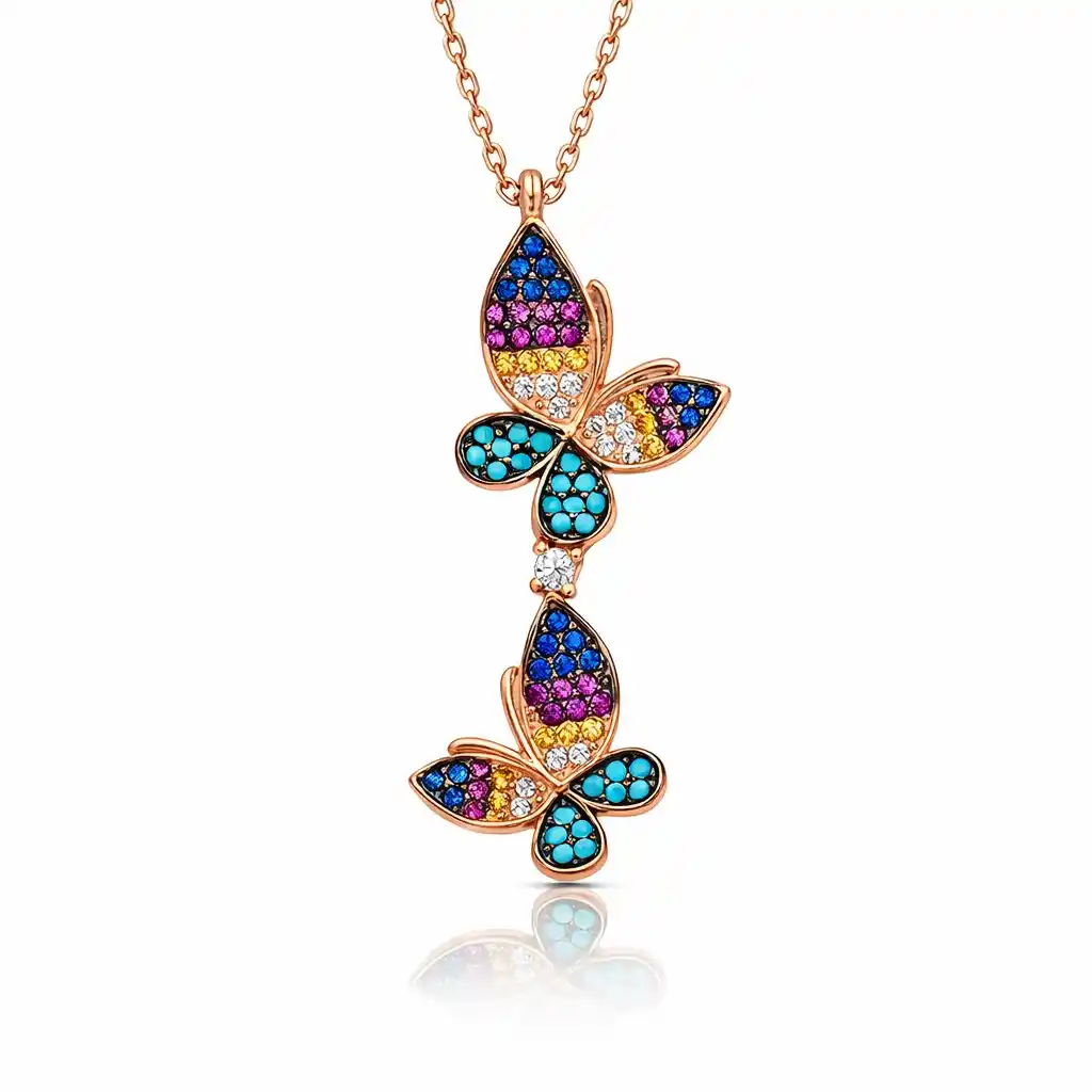 Tırtıldan kelebeğe bir dönüşüm. Rengarenk kanatları ile insanların beğenisini kazanmış bir canlıdır. Kelebek simgesi; huzur, mutluluk, gençlik ve romantizm duygularının tekrar canlanması, temiz ve saf bir sevgi değeri taşımaktadır. Bayanların genellikle kolye ve bileklikler de kullandıkları son derece zarif görüntü sunan kelebek modelleri; Yunan ve Uzak Doğu takı dünyasında popüler bir yer almakta, bedenin olgunlaşması temsil etmektedir. Psikolojik olarak ise kelebek modelleri için ruhun değişimi ve yenilenmesi olarak anlatılmaktadır. Bu şık kolye; doğum günü hediyesi, sevgililer günü veya özel günlerde tercih edilebilecek mükemmel bir seçenektir. Kolye 925 ayar gümüşten üretilmiştir. Gümüş üzerine rose altın kaplama yapılmıştır. Rose altın kaplama yapılan bayan kolyeler parlaklığını uzun süre muhafaza eder, gümüş rengini pembe renge dönüştürür ve oksitlenmeyi geciktirir. Tüm gümüş kolyelerde olduğu gibi gümüş kelebek kolye de el emeği ile üretilmiştir. Üzerinde bulunan taşlar zirkondur. Gümüş ve değerli taşlar nedeniyle belirtilen ürün ağırlığında ± %10 sapma olabilmektedir.