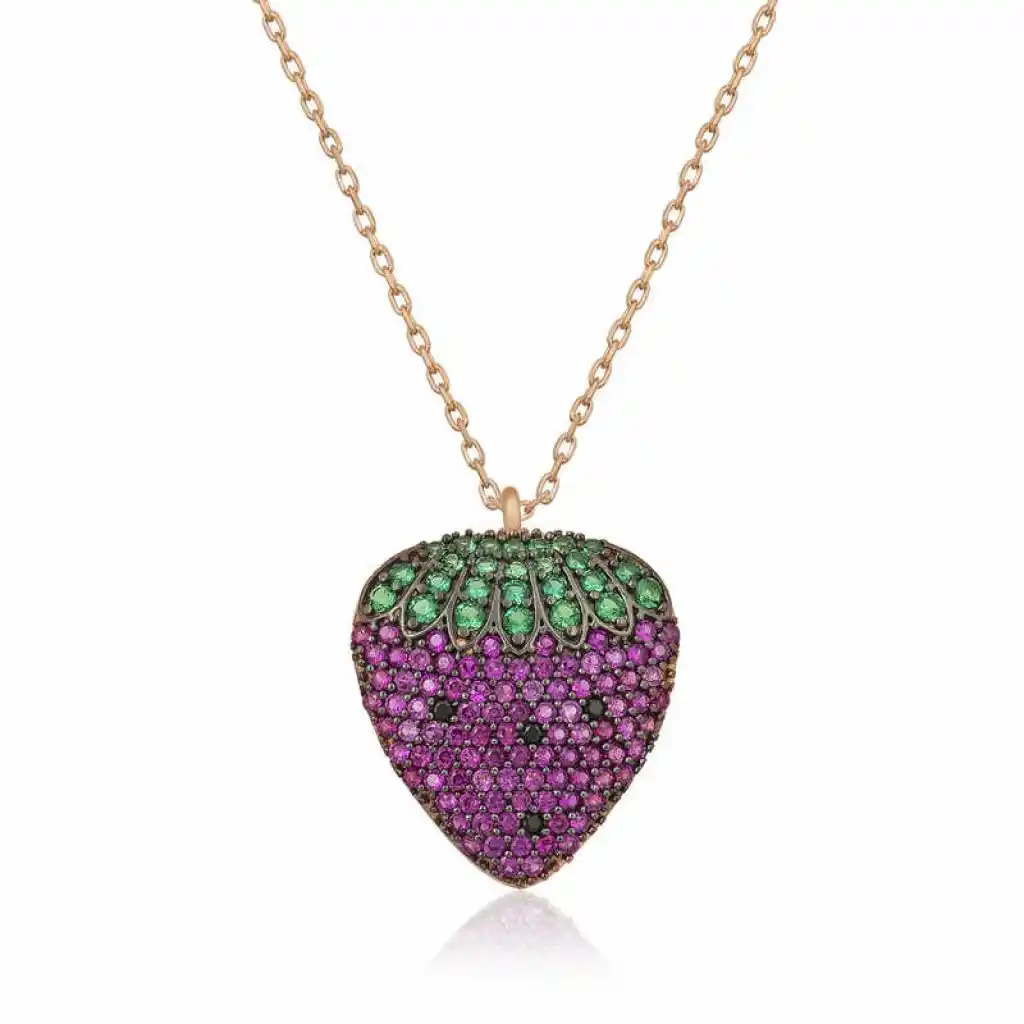 Farklılıktan yanaysanız bu kolye tam siz göre... Yaz aylarının en sevilen meyvelerinden biri olan çilek bu kez gümüş kolye tasarımı ile sizlerle buluşuyor. Gümüş çilek kolyeyi sevgilinize veya tüm sevdiklerinize, doğum gününde, yıl dönümünüzde, yılbaşında ve sevgililer gününde hediye edebilirsiniz. Gümüş üzerine rose altın kaplama yapılmıştır. Rose altın kaplama yapılan gümüş bayan kolyeler parlaklığını uzun süre muhafaza eder ve oksitlenmesi gecikir. Rose altın kaplama, gümüşe bakır rengini verir. Tüm bayan gümüş kolyelerde olduğu gibi gümüş çilek kolye de el emeği ile üretilmiştir. Gümüş ve değerli taşlar nedeniyle belirtilen ürün ağırlığında ± %10 sapma olabilmektedir.