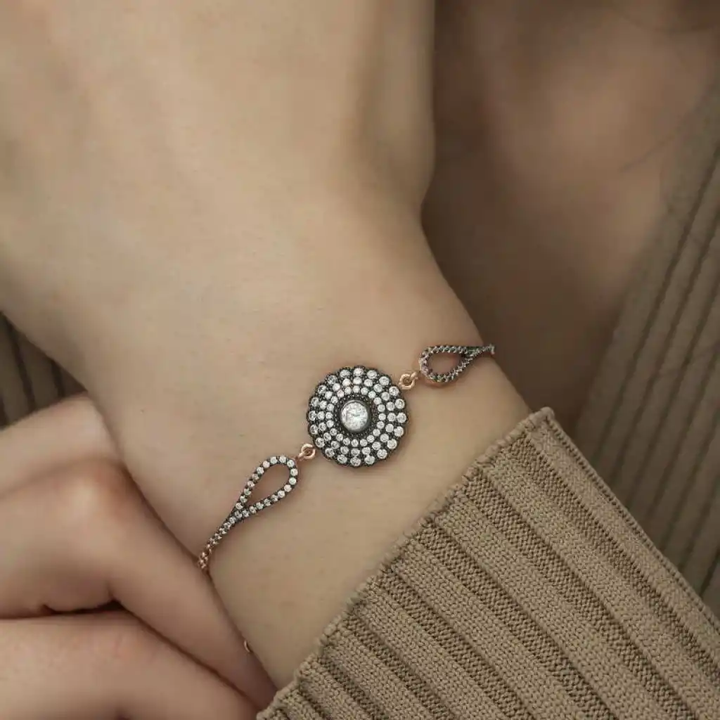 Sevdiklerinize duygularınızı ifade etmenin en özel ve zarif yolu ona gönderebileceğiniz şık, rengarenk ve mis kokulu çiçeklerdir. Özel günlerde verilecek hediyeler arasında olan çiçekler, bu kez gümüş bileklik ile anlam buldu. En kaliteli, en parlak, en ışıltılı taşlarla hazırlanmış gümüş elmas montür çiçek bileklik modeli sevgisini bir kez daha anlatmak isteyenleri, sen bir çiçeksin demek isteyenleri bekliyor. Bu şık bayan bileklik modeli 925 ayar gümüşten imal edilmiştir. Gümüş üzerine rose altın kaplama yapılmıştır. Rose altın kaplama yapılan gümüş bayan bileklik modelleri parlaklığını uzun süre muhafaza eder ve oksitlenmesi gecikir. Bileklik üzerinde bulunan beyaz taşlar zirkondur. Tüm bayan bileklik modellerinde olduğu gibi gümüş elmas montür çiçek bayan bileklik modeli de el emeği ile üretilmiştir. Gümüş ve değerli taşlar nedeniyle belirtilen ortalama ürün ağırlığında ± %10 sapma olabilmektedir.
