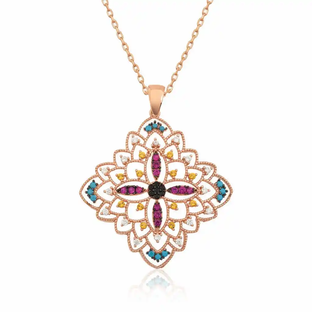 Renkli zirkon taşlar ile süslenmiş etnik desenli madalyon kolye, şık ve ışıltıyı sevenler için tasarlandı. Günün her anında severek kullanabileceğiniz, herkesin beğenisini toplayabilecek ve göz kamaştırabilecek bir üründür. Gümüş etnik desenli madalyon bayan kolye 925 ayar gümüşten imal edilmiştir. Bu kolye üzerine rose kaplama yapılmıştır.Rose kaplama yapılan ürünler parlaklığını uzun süre muhafaza eder ve gümüşü bakır rengine dönüştürür. Üzerinde bulunan taşlar zirkon"dur. Tüm gümüş bayan kolye modellerinde olduğu gibi gümüş etnik desenli madalyon bayan kolye modeli de el emeği ile üretilmiştir. Gümüş ve değerli taşlar nedeniyle belirtilen ortalama ürün ağırlığında ± %10 sapma olabilmektedir.Ürünlerimizin tamamı el emeği ile üretilmiştir.