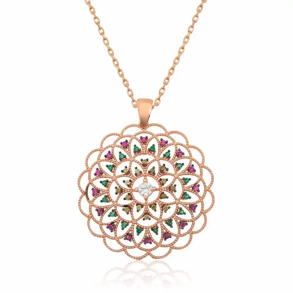 Renkli zirkon taşlar ile süslenmiş geometrik desenli madalyon kolye, şık ve ışıltıyı sevenler için tasarlandı. Günün her anında severek kullanabileceğiniz, herkesin beğenisini toplayabilecek ve göz kamaştırabilecek bir üründür. Gümüş geometrik desenli madalyon bayan kolye 925 ayar gümüşten imal edilmiştir. Bu kolye üzerine rose kaplama yapılmıştır.Rose kaplama yapılan ürünler parlaklığını uzun süre muhafaza eder ve gümüşü bakır rengine dönüştürür. Üzerinde bulunan taşlar zirkon"dur. Tüm gümüş bayan kolye modellerinde olduğu gibi gümüş geometrik desenli madalyon bayan kolye modeli de el emeği ile üretilmiştir. Gümüş ve değerli taşlar nedeniyle belirtilen ortalama ürün ağırlığında ± %10 sapma olabilmektedir. Ürünlerimizin tamamı el emeği ile üretilmiştir.