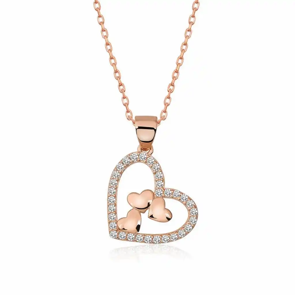 Gümüş Rose Kalbin İçinde Üç Kalp Kolye