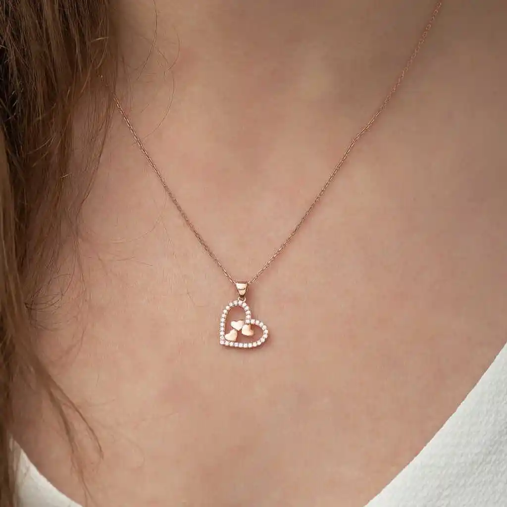 Kalp simgesi daima koşulsuz sevginin ve aşkın sembolü olmuştur. Dini öğretilerde ise kalbin gücü sınırsızdır. Çünkü kalp Yaradanın evi, bizim ise evrene açılan gerçeklik kapımızdır. kalbin içinde üç kalp kolye sevginizi temsil edecek en şık ve anlamlı kolyelerden biridir. Bu şık kalbin içinde üç kalpli kolye; doğum günü hediyesi, sevgililer günü hediyesi veya annelere hediye olarak özel günlerde tercih edilebilecek mükemmel bir seçenektir. Gümüş zirkon taşlı kalbin içinde üç kalp bayan kolye 925 ayar gümüşten imal edilmiştir. Bu kolye üzerinde rose kaplama yapılmıştır. Rose kaplama yapılan gümüş bayan kolye modelleri parlaklığını uzun süre muhafaza eder. Üzerinde bulunan ışıl ışıl taşlar zirkondur. Tüm gümüş bayan kolye modellerinde olduğu gibi gümüş kalbin içinde üç kalp bayan kolye modeli de el emeği ile üretilmiştir. Gümüş ve değerli taşlar nedeniyle belirtilen ortalama ürün ağırlığında ± %10 sapma olabilmektedir.
