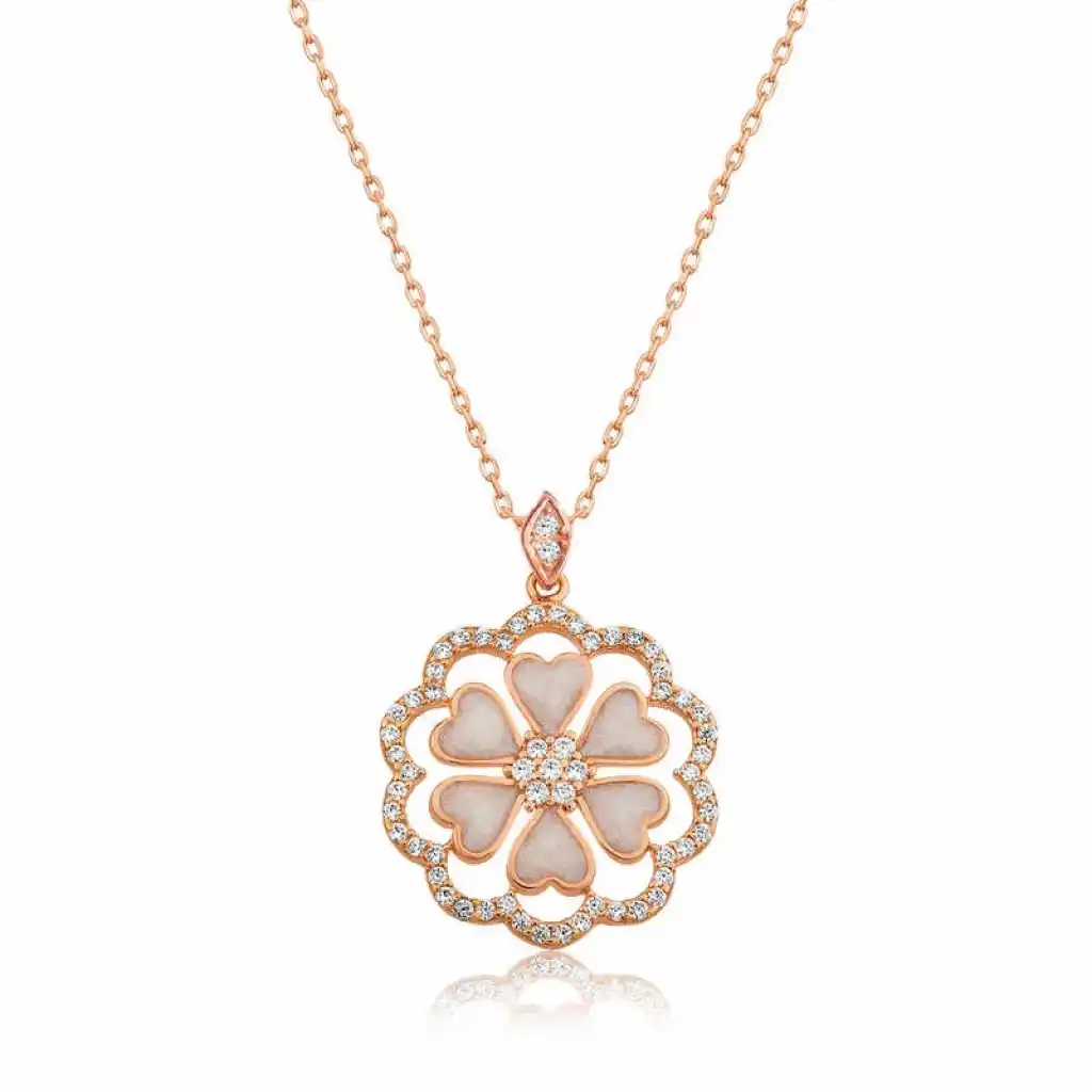 Kalpli yapraklardan oluşan şık çiçek desenli gümüş kolye modeli severek kullanabileceğiniz ve sevdiklerinize armağan edebileceğiniz hoş bir aksesuardır. Kalp yapraklı çiçekten oluşan özel tasarım bayan kolye modeli 925 ayar gümüşten imal edilmiştir. Bu zarif kolye genç aşıkların özel günlerde tercih edebileceği çok şık bir seçenek olacaktır. Bu özel kolye ile sevdiğinizin boynunu aşkla süsleyin. Gümüş kalp çiçek bayan kolye modeli üzerinde rose altın kaplama ve beyaz sedefli mine bulunmaktadır. Rose altın kaplama yapılan gümüş bayan kolye modelleri parlaklığını uzun süre muhafaza eder. Gümüş kalp çiçek bayan kolye sizin olduğu kadar sevdiklerinizin de keyifle takacağı en güzel hediyelerden biri olacaktır. Tüm gümüş bayan kolye modellerimizde olduğu gibi gümüş kalp çiçek bayan kolye de el emeği ile üretilmiştir. Gümüş ve değerli taşlar nedeniyle belirtilen ortalama ürün ağırlığında ± %10 sapma olabilmektedir.