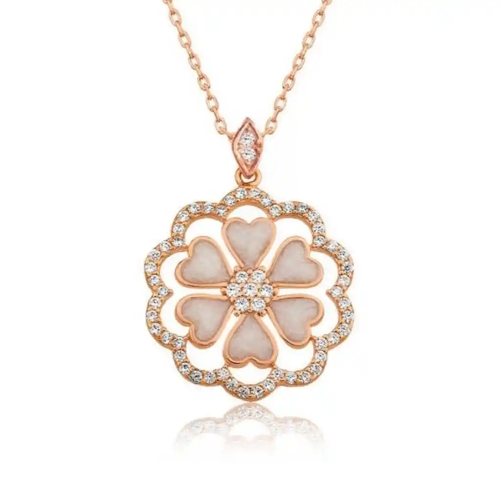 Kalpli yapraklardan oluşan şık çiçek desenli gümüş kolye modeli severek kullanabileceğiniz ve sevdiklerinize armağan edebileceğiniz hoş bir aksesuardır. Kalp yapraklı çiçekten oluşan özel tasarım bayan kolye modeli 925 ayar gümüşten imal edilmiştir. Bu zarif kolye genç aşıkların özel günlerde tercih edebileceği çok şık bir seçenek olacaktır. Bu özel kolye ile sevdiğinizin boynunu aşkla süsleyin. Gümüş kalp çiçek bayan kolye modeli üzerinde rose altın kaplama ve beyaz sedefli mine bulunmaktadır. Rose altın kaplama yapılan gümüş bayan kolye modelleri parlaklığını uzun süre muhafaza eder. Gümüş kalp çiçek bayan kolye sizin olduğu kadar sevdiklerinizin de keyifle takacağı en güzel hediyelerden biri olacaktır. Tüm gümüş bayan kolye modellerimizde olduğu gibi gümüş kalp çiçek bayan kolye de el emeği ile üretilmiştir. Gümüş ve değerli taşlar nedeniyle belirtilen ortalama ürün ağırlığında ± %10 sapma olabilmektedir.