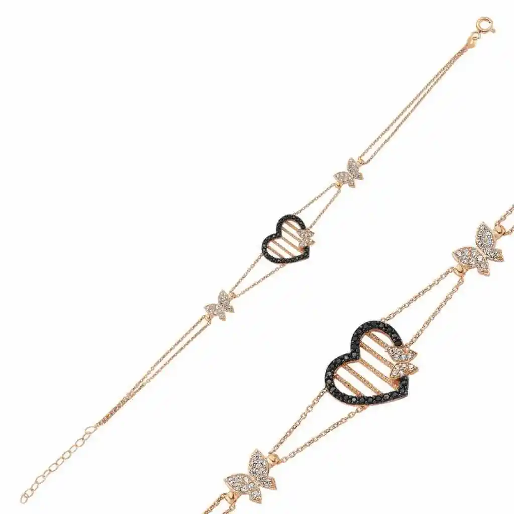 Gümüş Rose Kalpli Kelebek Bayan Bileklik