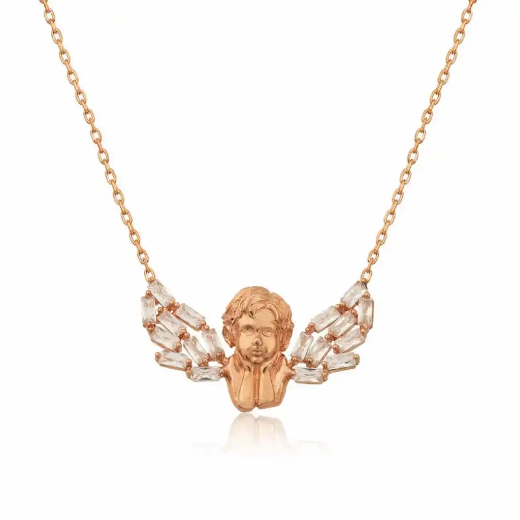 Kanatlı melek motifi ile tasarlanmış bu bayan kolye modeli 925 ayar gümüşten imal edilmiştir. Gümüş üzerinde bulunan taşlar zirkondur. Gümüş kanatlı melek kolye üzerine rose altın kaplama yapılmıştır. Rose altın kaplama yapılan tüm gümüş bayan kolye modelleri parlaklığını uzun süre muhafaza eder ve gümüşü pembe renge dönüştürür.Zincir uzunluğu 45 cm"dir. Tüm gümüş bayan kolye modellerinde olduğu gibi gümüş kanatlı melek bayan kolye modelimiz de el emeği ile üretilmiştir. Gümüş ve değerli taşlar nedeniyle belirtilen ortalama ürün ağırlığında ± %10 sapma olabilmektedir.