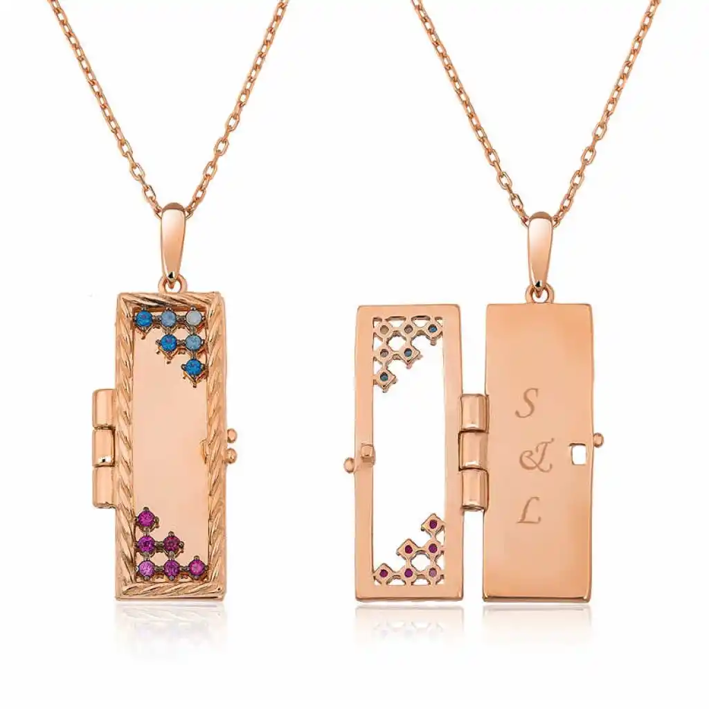 Sevgilinize duyduğunuz aşkınızı ve ilk anki mutluluğunuzu her an hatırlatabileceğiniz, en romantik anlarınıza eşlik edecek içine isimlerinizin baş harflerini yazdırabileceğiniz kapaklı kolye sevgililer için özel olarak tasarlandı. isimlerinizin baş harflerinin yazılı olduğu kişiye özel kolye uzun bir birliktelik beklediğiniz sevdiğinize verebileceğiniz en anlamlı hediyelerden biri olacaktır. Bu özel tasarım kolye 925 ayar gümüşten imal edilmiştir. Gümüş üzerine rose kaplama yapılmıştır. Rose kaplama yapılan gümüş bayan kolye modelleri parlaklığını uzun süre muhafaza eder, gümşü pembe renge çevirir ve oksitlenmesini geciktirir. Kolye üzerinde bulunan taşlar zirkondur. Zincir boyu ortalama 45 cm"dir. Gümüş ve değerli taşlar nedeniyle ürün ağırlığında ± %10 sapma olabilmektedir.