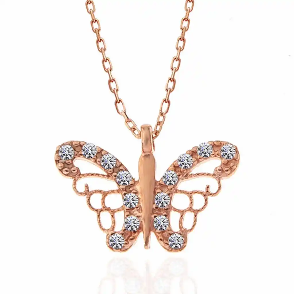 Kelebek; kadınlarca tercih edilen en popüler motiflerden biridir. Sevenlerine doğanın gizemini ve insan hayal gücünün zenginliğini hatırlatır. Özgürlüğü masumiyeti ve saflığı simgeleyen kelebekler, tertemiz sevginin ve aşkın ifadesidir. Sizin olduğu kadar sevdiklerinizin de keyifle takacağı kelebek kadın kolye, sevdiğinize en güzel hediyelerden biri olacaktır. Kolye 925 ayar gümüşten imal edilmiştir. Gümüş üzerine rose kaplama yapılmıştır. Rose kaplama yapılan gümüş kadın kolyeler parlaklığını uzun süre muhafaza eder ve oksitlenmesini geciktirir. Gümüş olan zincir boyu ortalama 45 cm"dir. Tüm gümüş kadın kolyelerde olduğu gibi gümüş kelebek kadın kolye modeli de el emeği ile üretilmiştir. Gümüş ve değerli taşlar nedeniyle belirtilen ortalama ürün ağırlığında ± %10 sapma olabilmektedir.