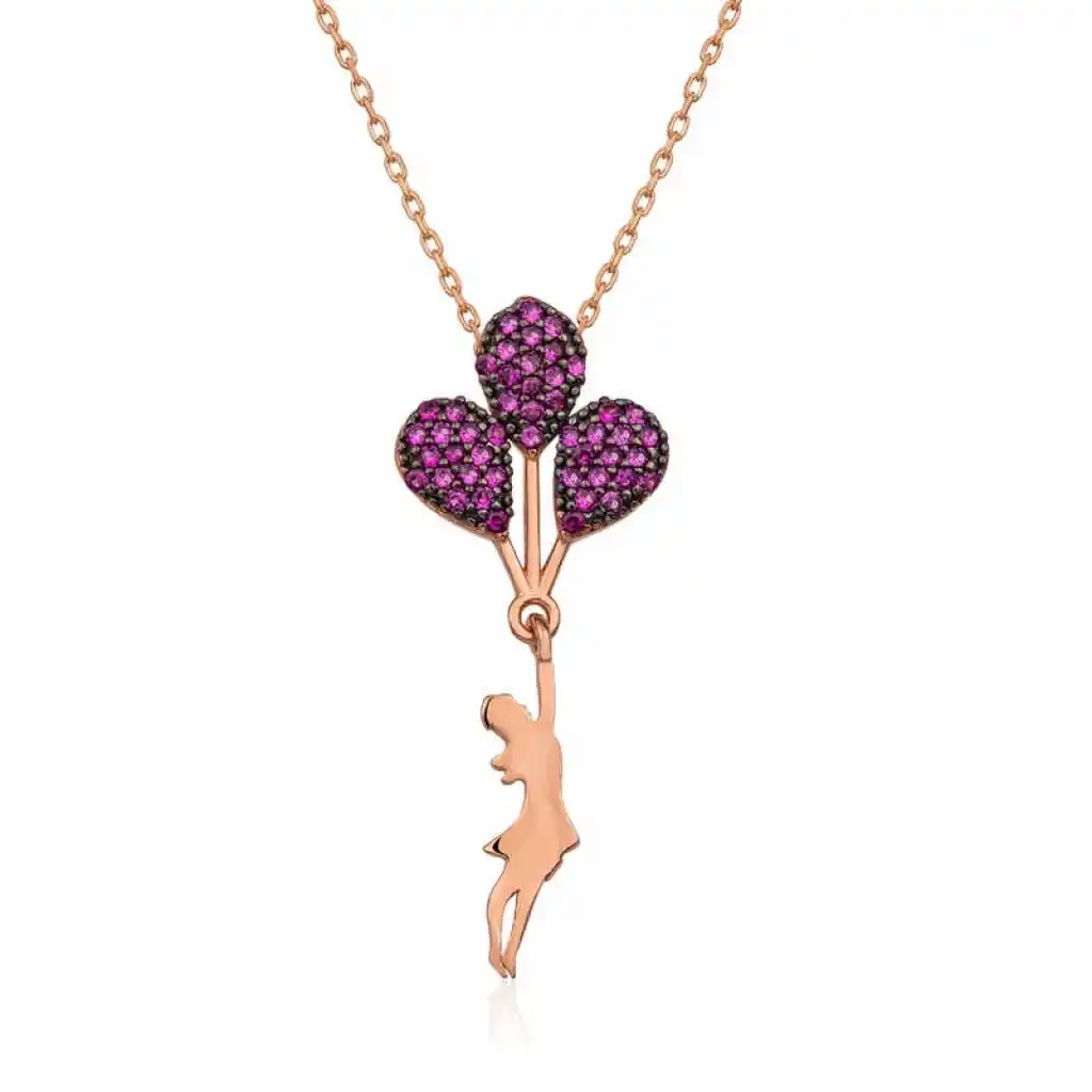 Balonlar; bizleri her ne kadar çocukluğumuza götürse de, yaş fark etmeksizin her an yüzümüzde tebessüme neden olmaktadır. Özgürlüğünün ipi ellerimizin ucunda olan balon, güzel günleri anımsatan içimizde bir yerlerde duran küçük kızı ortaya çıkarmaktadır. Bu harika tasarım kırmızı balon tutan kız kolye; doğum günü hediyesi, sevgililer günü hediyesi veya özel günlerde tercih edilebilecek mükemmel bir seçenektir. Bu şık tasarım 925 ayar gümüşten imal edilmiştir. Bu kolye üzerine rose kaplama yapılmıştır. Rose kaplama yapılan kolyeler parlaklığını uzun süre muhafaza eder, gümüş rengini pembe renge çevirir. Tüm gümüş bayan kolyelerde olduğu gibi kırmızı balonlu kız kolye de el emeği ile üretilmiştir. Gümüş ve değerli taşlar nedeniyle belirtilen ürün ağırlığında ± %10 sapma olabilmektedir.