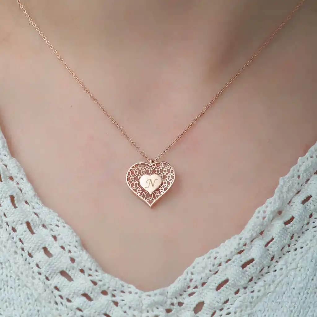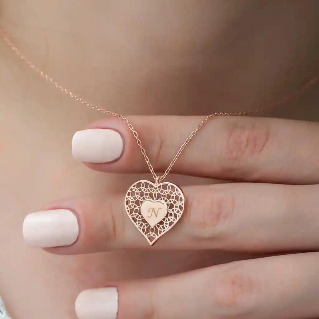 Gümüş Rose Kişiye Özel Kalbin İçinde Kalp Bayan Kolye