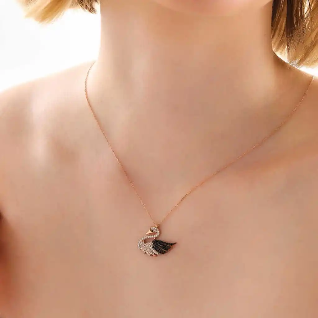 Kuğu; en asil, duru ve zarif duruşuyla aşıkları temsil ediyor... Bu şık ve göz alıcı kolye; doğum günü hediyesi, sevgililer günü hediyesi veya annelere hediye olarak özel günlerde tercih edilebilecek mükemmel bir seçenektir. Üzerinde bulunan beyaz taşlar zirkondur. Kuğu kolye modelleri narinlik ve saflığın sembolü olarak bilinir. Bu sayede şık bir hediye seçeneğidir. Kolye ile birlikte gelen zincir tamamen gümüş olup 45 cm uzunluğundadır. Gümüş üzerine rose kaplama yapılmıştır. Rose kaplama yapılan gümüş kadın kolyeler parlaklığını uzun süre muhafaza eder, oksitlenmesi gecikir. Tüm gümüş kadın kolye modellerinde olduğu gibi gümüş kadın kuğu kolye modeli de tamamen el emeği üretilmiştir. Bu nedenle maden ve değerli taşlardan dolayı belirtilen ortalama ürün ağırlığında ± %10 sapma olabilmektedir.