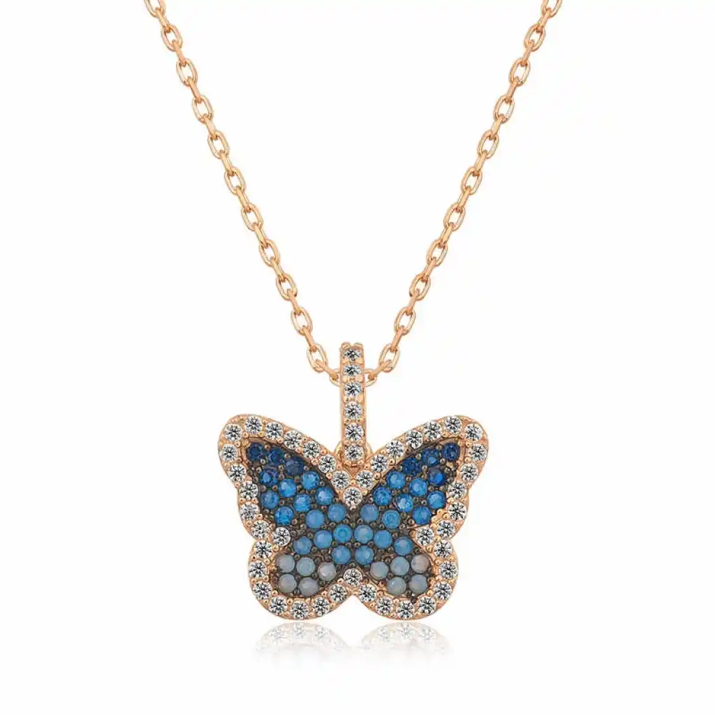 Tırtıldan kelebeğe bir dönüşüm. Rengarenk kanatları ile insanların beğenisini kazanmış bir canlıdır. Kelebek simgesi; huzur, mutluluk, gençlik ve romantizm duygularının tekrar canlanması, temiz ve saf bir sevgi değeri taşımaktadır. Bayanların genellikle kolye ve bileklikler de kullandıkları son derece zarif görüntü sunan kelebek modelleri; Yunan ve Uzak Doğu takı dünyasında popüler bir yer almakta, bedenin olgunlaşmasını temsil etmektedir. Psikolojik olarak ise kelebek modelleri için ruhun değişimi ve yenilenmesi olarak anlatılmaktadır. Bu şık kolye; doğum günü hediyesi, sevgililer günü veya özel günlerde tercih edilebilecek mükemmel bir seçenektir. Kolye 925 ayar gümüşten üretilmiştir. Gümüş üzerine rose kaplama yapılmıştır.Rose kaplama yapılan bayan kolyeler parlaklığını uzun süre muhafaza eder, gümüş rengini pembe renge dönüştürür ve oksitlenmeyi geciktirir. Tüm gümüş kolyelerde olduğu gibi gümüş mavi kelebek kolye de el emeği ile üretilmiştir. Üzerinde bulunan taşlar zirkondur. Gümüş ve değerli taşlar nedeniyle belirtilen ürün ağırlığında ± %10 sapma olabilmektedir.