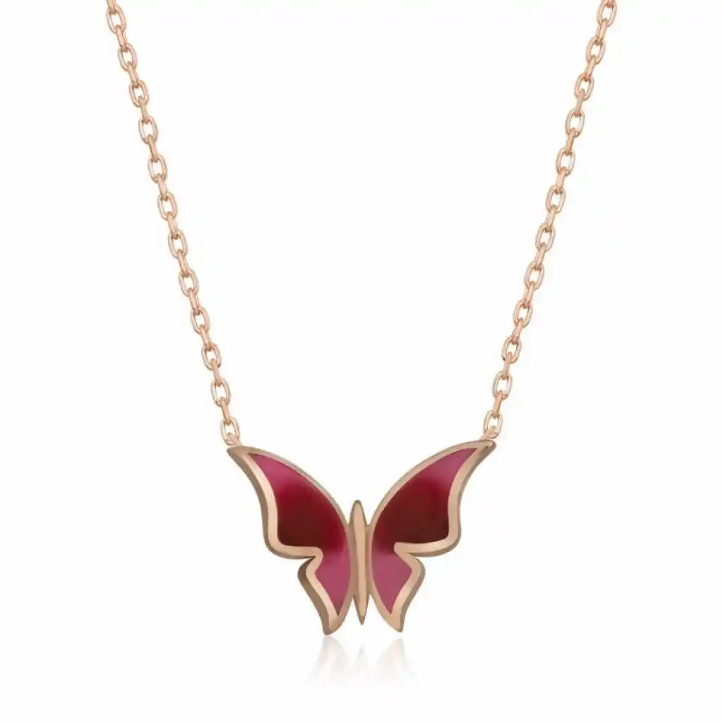 Özgürlüğü masumiyeti ve saflığı simgeleyen kelebekler, tertemiz sevginin ve aşkın ifadesidir. Bahar kelebekleri kolye anlam itibari ile aşkın küçük bir kıvılcım ile başladığı daha sonra büyük bir sabır ile büyüdüğü ve en sonunda ilan-ı aşkı ifade eder. Sizin olduğu kadar sevdiklerinizin de keyifle takacağı minimal kelebek bayan kolye en güzel hediyelerden biri olacaktır. Kolye 925 ayar gümüşten imal edilmiştir. Gümüş üzerine rose kaplama yapılmıştır. Rose kaplama yapılan gümüş bayan kolyeler parlaklığını uzun süre muhafaza eder, ve oksitlenmeyi geciktirir. Kolye üzerinde bulunan renkler mine işlemesidir. Gümüş olan zincir boyu ortalama 45 cm"dir. Tüm gümüş bayan kolyelerde olduğu gibi gümüş minimal kelebek bayan kolye de el emeği ile üretilmiştir. Gümüş ve değerli taşlar nedeniyle belirtilen ürün ağırlığında ± %10 sapma olabilmektedir.