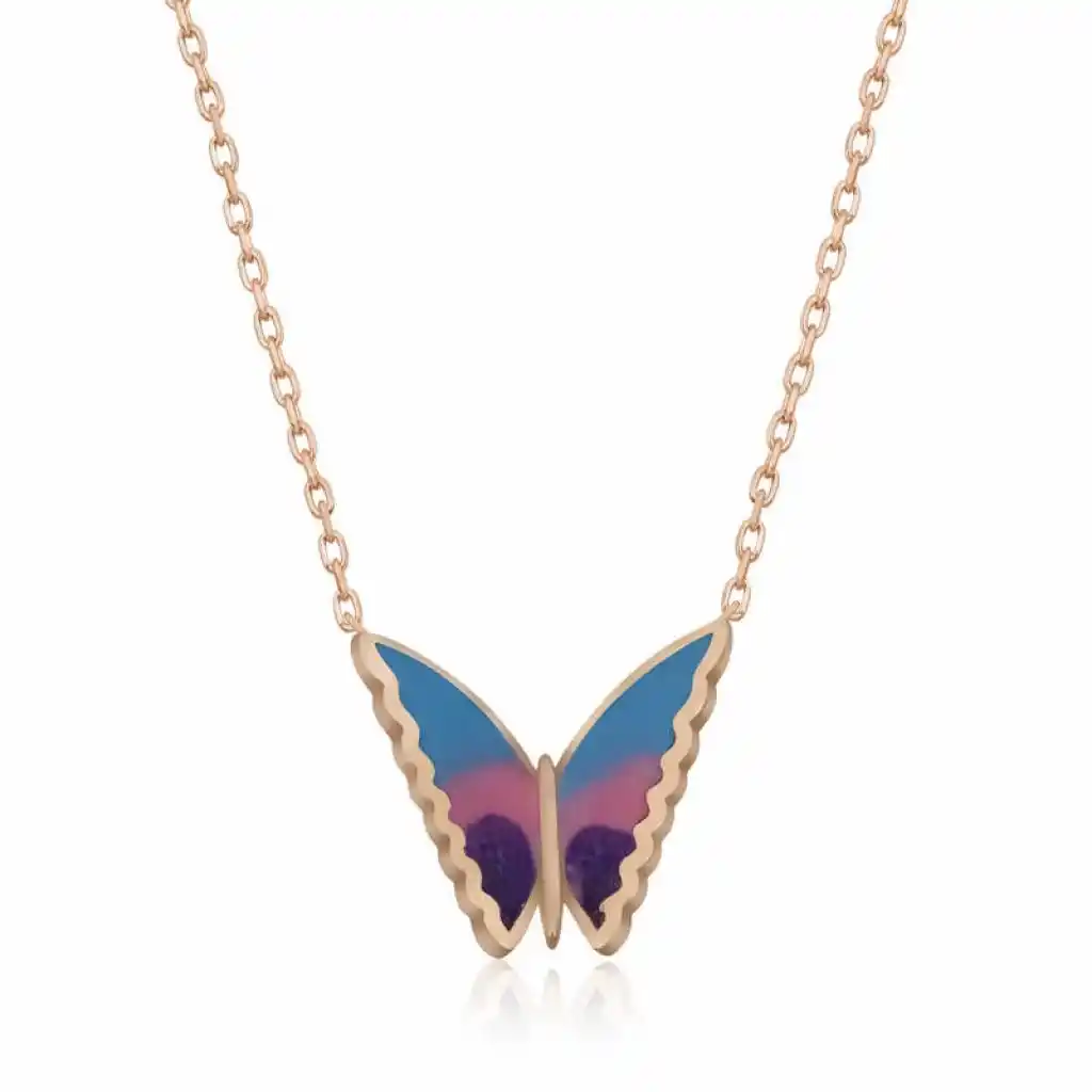 Özgürlüğü masumiyeti ve saflığı simgeleyen kelebekler, tertemiz sevginin ve aşkın ifadesidir. Bahar kelebekleri kolye anlam itibari ile aşkın küçük bir kıvılcım ile başladığı daha sonra büyük bir sabır ile büyüdüğü ve en sonunda ilan-ı aşkı ifade eder. Sizin olduğu kadar sevdiklerinizin de keyifle takacağı minimal kelebek bayan kolye en güzel hediyelerden biri olacaktır. Kolye 925 ayar gümüşten imal edilmiştir. Gümüş üzerine rose kaplama yapılmıştır. Rose kaplama yapılan gümüş bayan kolyeler parlaklığını uzun süre muhafaza eder, ve oksitlenmeyi geciktirir. Kolye üzerinde bulunan renkler mine işlemesidir. Gümüş olan zincir boyu ortalama 45 cm"dir. Tüm gümüş bayan kolyelerde olduğu gibi gümüş minimal kelebek bayan kolye de el emeği ile üretilmiştir. Gümüş ve değerli taşlar nedeniyle belirtilen ürün ağırlığında ± %10 sapma olabilmektedir.