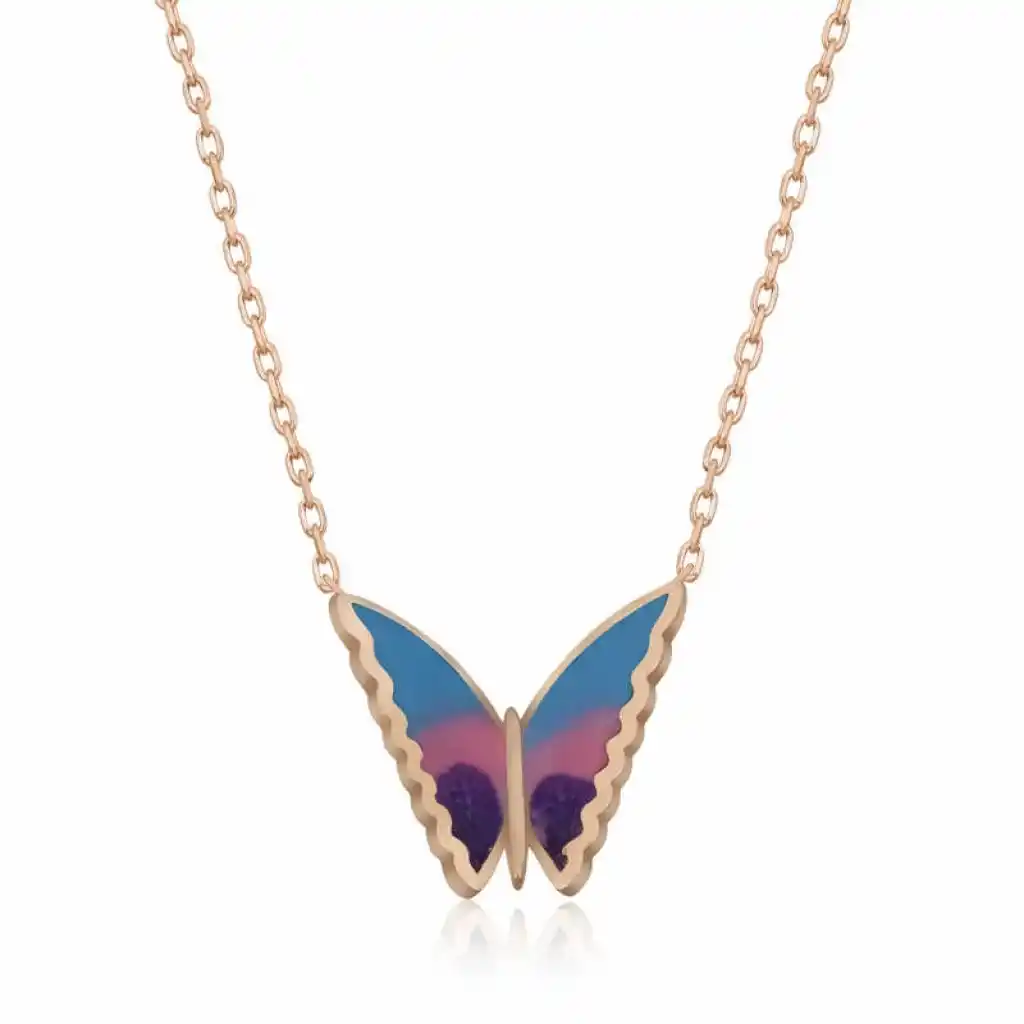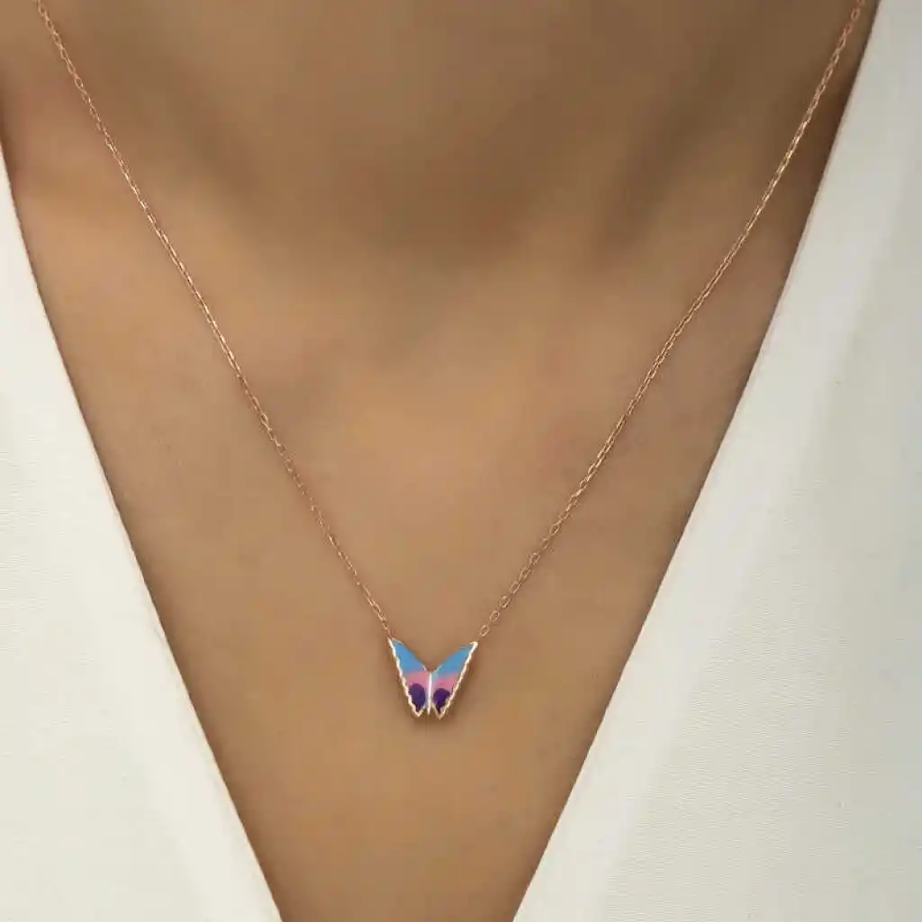 Özgürlüğü masumiyeti ve saflığı simgeleyen kelebekler, tertemiz sevginin ve aşkın ifadesidir. Bahar kelebekleri kolye anlam itibari ile aşkın küçük bir kıvılcım ile başladığı daha sonra büyük bir sabır ile büyüdüğü ve en sonunda ilan-ı aşkı ifade eder. Sizin olduğu kadar sevdiklerinizin de keyifle takacağı minimal kelebek bayan kolye en güzel hediyelerden biri olacaktır. Kolye 925 ayar gümüşten imal edilmiştir. Gümüş üzerine rose kaplama yapılmıştır. Rose kaplama yapılan gümüş bayan kolyeler parlaklığını uzun süre muhafaza eder, ve oksitlenmeyi geciktirir. Kolye üzerinde bulunan renkler mine işlemesidir. Gümüş olan zincir boyu ortalama 45 cm"dir. Tüm gümüş bayan kolyelerde olduğu gibi gümüş minimal kelebek bayan kolye de el emeği ile üretilmiştir. Gümüş ve değerli taşlar nedeniyle belirtilen ürün ağırlığında ± %10 sapma olabilmektedir.
