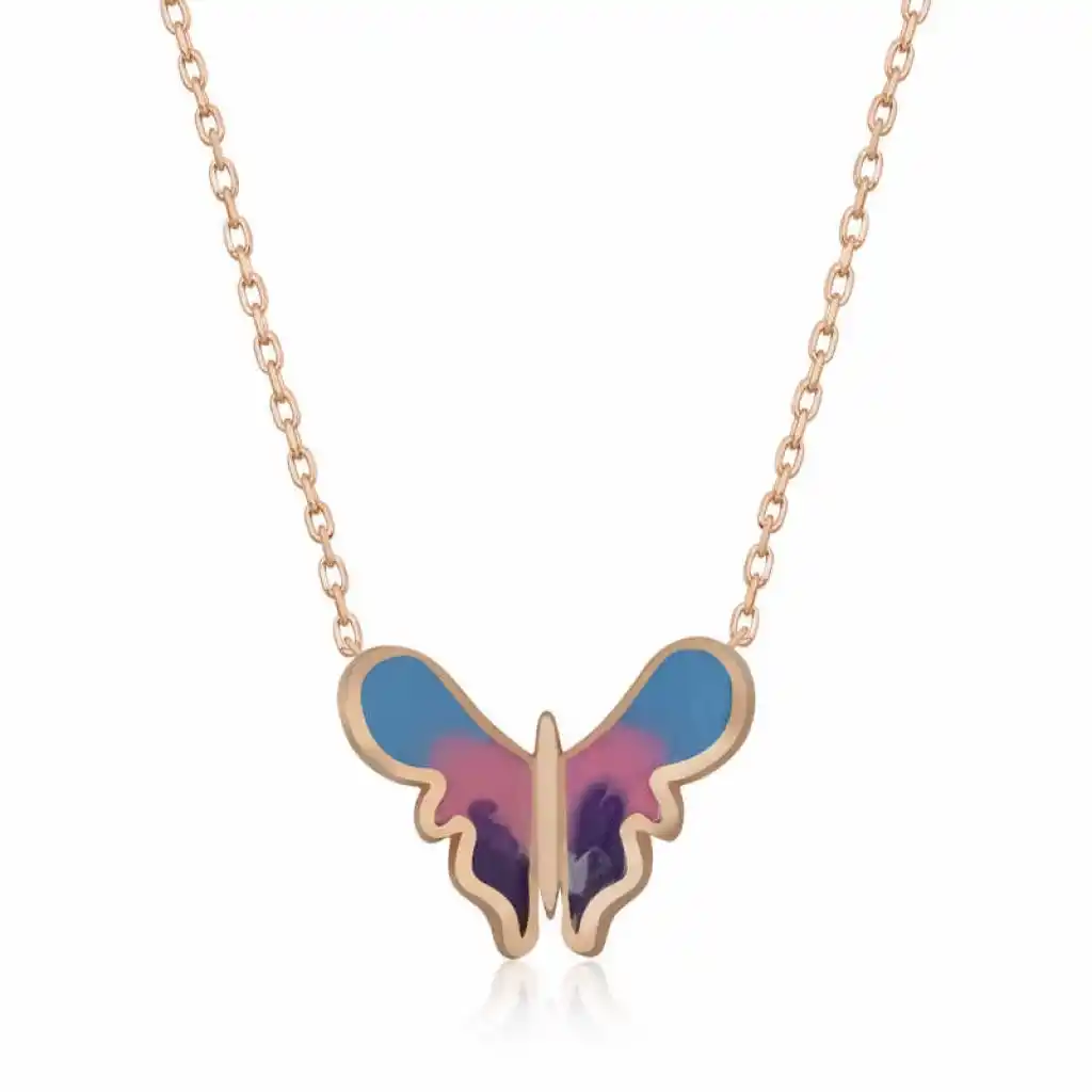 Özgürlüğü masumiyeti ve saflığı simgeleyen kelebekler, tertemiz sevginin ve aşkın ifadesidir. Bahar kelebekleri kolye anlam itibari ile aşkın küçük bir kıvılcım ile başladığı daha sonra büyük bir sabır ile büyüdüğü ve en sonunda ilan-ı aşkı ifade eder. Sizin olduğu kadar sevdiklerinizin de keyifle takacağı minimal kelebek bayan kolye en güzel hediyelerden biri olacaktır. Kolye 925 ayar gümüşten imal edilmiştir. Gümüş üzerine rose kaplama yapılmıştır. Rose kaplama yapılan gümüş bayan kolyeler parlaklığını uzun süre muhafaza eder, ve oksitlenmeyi geciktirir. Kolye üzerinde bulunan renkler mine işlemesidir. Gümüş olan zincir boyu ortalama 45 cm"dir. Tüm gümüş bayan kolyelerde olduğu gibi gümüş minimal kelebek bayan kolye de el emeği ile üretilmiştir. Gümüş ve değerli taşlar nedeniyle belirtilen ürün ağırlığında ± %10 sapma olabilmektedir.
