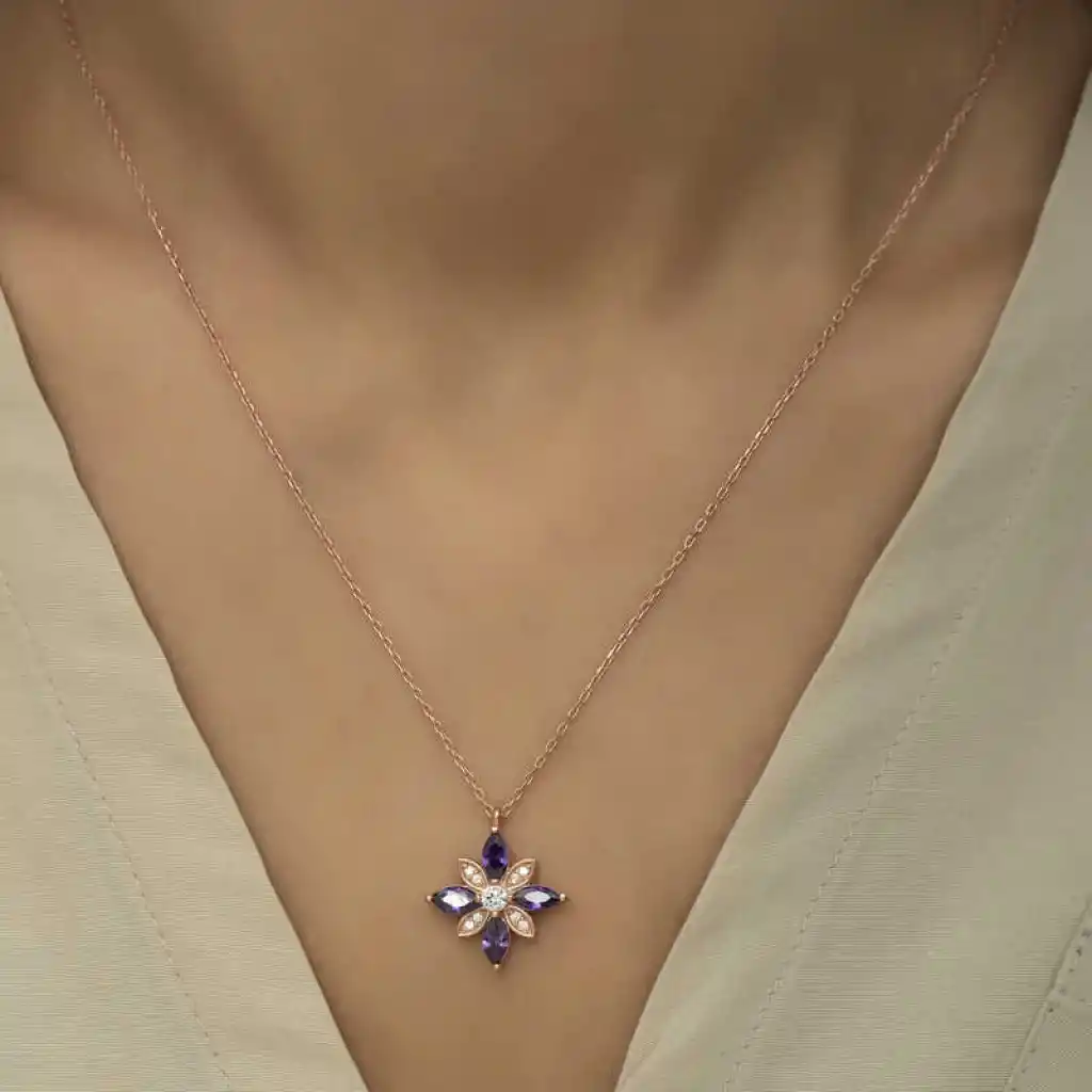 Gümüş Rose Mor Taşlı Umut Çiçeği Kolye