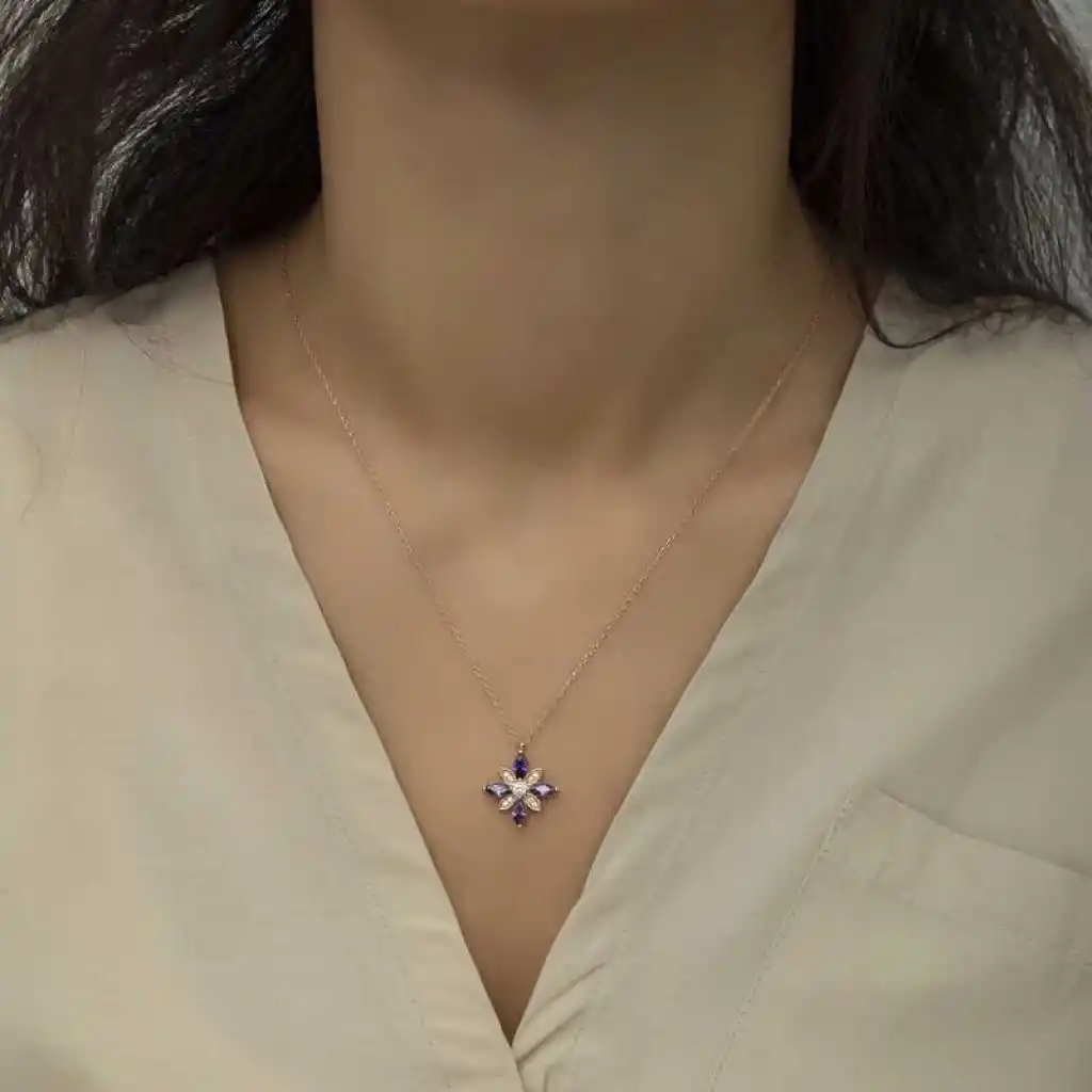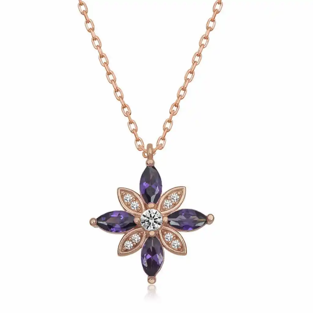 Gümüş Rose Mor Taşlı Umut Çiçeği Kolye