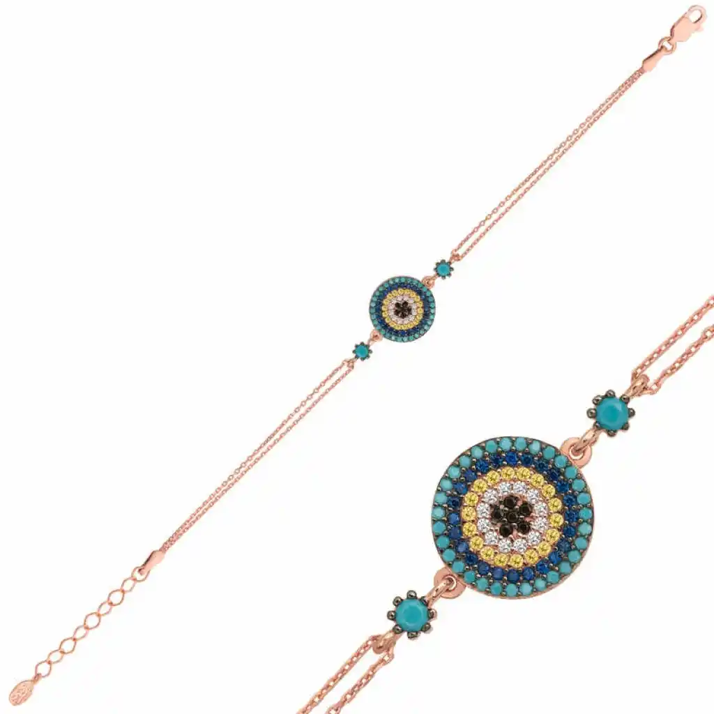 Nazar boncuğunu insanlar uzun yıllardan beri kötü bakıştan korunmak için kullanmışlardır. Kötü bakışların insanlar üzerinde olumsuz etki oluşturmasına karşı bir önlemdir nazar boncuğu… Bu sebeptendir ki insanlar sevdiklerini korumak için nazar boncuğu takmaktadır. Bu nazar bileklik de şıklığı ve zarafeti yansıtıyor. Her dönem sevilen ve şıklığından ödün vermeyen bu modeli; doğum günü hediyesi, sevgililer günü hediyesi veya annelere hediye olarak özel günlerde tercih edebilirsiniz. Rose nazar bayan bileklik, 925 ayar gümüşten imal edilmiştir. Gümüş üzerine rose kaplama yapılmıştır. Rose kaplama yapılan bayan bileklikler parlaklığını uzun süre muhafaza eder, gümüş rengini pembe renge dönüştürür ve oksitlenmeyi geciktirir. Bileklik üzerinde bulunan taşlar zirkondur. Tüm gümüş bayan bileklik modellerinde olduğu gibi bu gümüş rose nazar bayan bileklik de tamamı el emeği ile üretilmiştir. Gümüş ve değerli taşlar nedeniyle belirtilen ortalama ürün ağırlığında ± %10 sapma olabilmektedir.