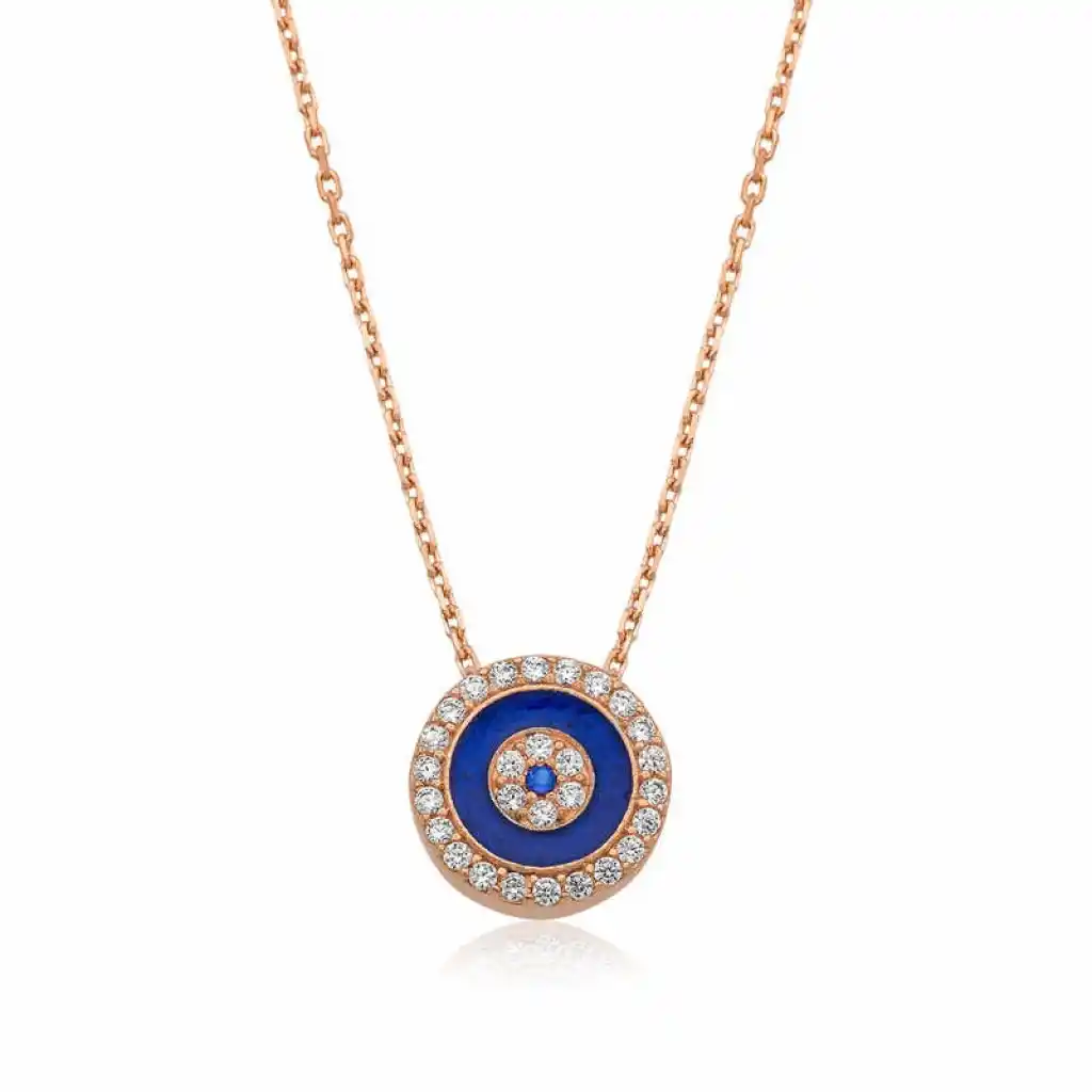 Birçok kültürde kötü enerjinin zararlarından korunmak için çeşitli tılsımlar kullanılmıştır. Doğu kültürlerinin çoğunda kullanılan tılsım ise gözdür. Nazar boncuğu da göz şeklinden ilhamla tasarlanmıştır. Mavi rengin seçilmesi de tesadüf değildir. Renkli gözlü kişilerin enerjisini daha etkili yansıttığı inancı gereği nazar boncukları çoğunlukla mavi olarak tasarlanır. Güzelliğiyle göz kamaştıran, nazardan korunmasını istediğiniz kişilere ve sevdiklerinize nazar kolyeyi armağan edebilirsiniz. Nazar bayan kolye modeli 925 ayar gümüşten imal edilmiştir. Gümüş üzerine rose altın kaplama yapılmıştır. Rose altın kaplama yapılan gümüş nazar kolye modelleri parlaklığını uzun süre muhafaza eder ve oksitlenmesi gecikir. Kolye üzerinde bulunan taşlar zirkon"dur. Bu nazar bayan kolye modeli diğer tüm gümüş bayan kolye modellerinde olduğu gibi el emeği ile üretilmiştir. Gümüş ve değerli taşlar nedeniyle belirtilen ortalama ürün ağırlığında ± %10 sapma olabilmektedir.