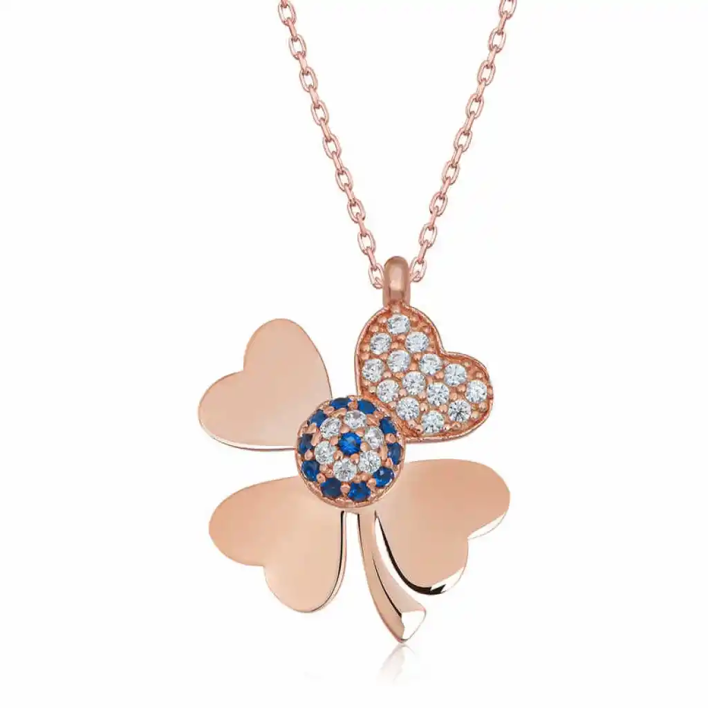 Gümüş Rose Nazarlı Dört Yapraklı Yonca Kadın Kolye