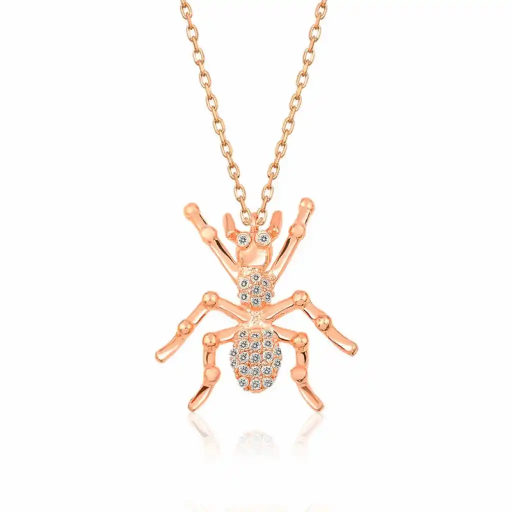 Örümcek; mitolojide, sembolizmde ve efsanelerde yer alan popüler kültürün çeşitli filmlerinde yer almışlardır. Müslümanlar için örümceğin önemi, Peygamberi (S.A.V) ve ilk Müslümanlardan Ebubekir’i (R.A.)Sevr Dağı’ndaki mağarada saklanırken koruyan ve düşmanının gözünden saklayan büyük ağı örmesinde yatar. Mağara önünde birden yetişen ağaca çabucak yuva kuran güvercinler de, bu öneme layık varlıklardandır. Gümüş örümcek bayan kolye modeli 925 ayar gümüşten imal edilmiştir. Gümüş üzerine rose kaplama yapılmıştır. Rose kaplama yapılan gümüş bayan kolyeler parlaklığını uzun süre muhafaza eder ve oksitlenmesi gecikir. Gümüş olan zincirin boyu ortalama 45 cm'dir. Tüm gümüş bayan kolye modellerinde olduğu gibi gümüş örümcek bayan kolye modeli de el emeği ile üretilmiştir. Gümüş ve değerli taşlar nedeniyle belirtilen ortalama ürün ağırlığında ± %10 sapma olabilmektedir.