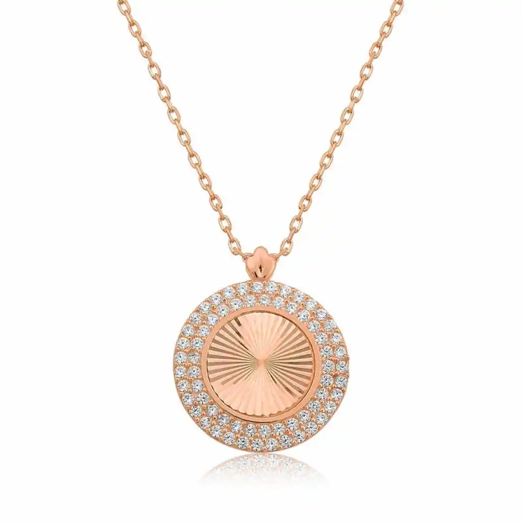 Oval fırfır desen etrafına sıralanmış zirkon taşlar ile tasarlanmış şık ve ışıltılı modern kolye günün her anında severek kullanabileceğiniz, herkesin beğenisini toplayabilecek ve göz kamaştırabilecek bir üründür. Bu şık oval fırfır desenli bayan kolye; doğum günü hediyesi, sevgililer günü hediyesi veya annelere hediye olarak özel günlerde tercih edilebilecek mükemmel bir seçenektir. Gümüş oval fırfır bayan kolye 925 ayar gümüşten imal edilmiştir. Bu kolye üzerinde rose altın kaplama yapılmıştır. Rose altın kaplama yapılan gümüş oval fırfır bayan kolye modelleri parlaklığını uzun süre muhafaza eder. Ürünlerimizin tamamı el emeği ile üretilmiştir. Gümüş ve değerli taşlar nedeniyle belirtilen ortalama ürün ağırlığında ± %10 sapma olabilmektedir.