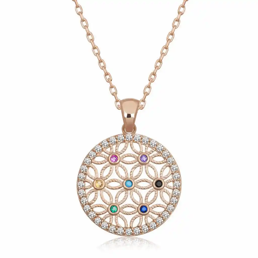Gümüş Rose Renkli Taşlı Yaşam Çiçeği Kadın Kolye