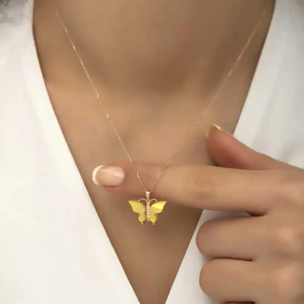 Gümüş Rose Sarı Kaplangözü Taşlı Kelebek Bayan Kolye