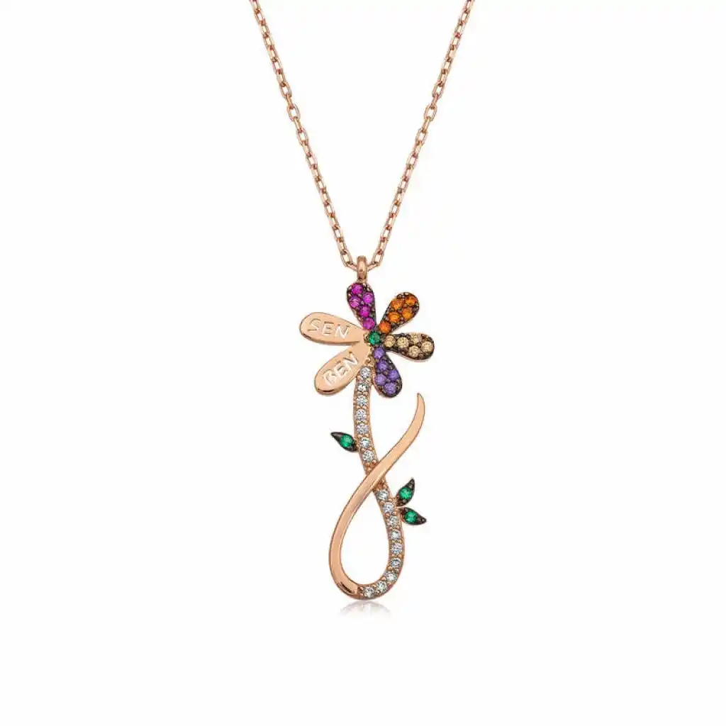 Papatya çiçeği temiz sevgi anlamını ifade eder. En büyük özelliklerinden biri her sapında bir tane olmasıdır. Bu güzellik tasarlanarak ortaya çıkan bu yapraklarından birinde sen diğerinde ben yazan diğer yapraklarında ışıl ışıl kolye zirkon taşlarla süslenmiş bu şık kolye; doğum günü hediyesi, sevgililer günü hediyesi veya annelere hediye olarak özel günlerde tercih edilebilecek mükemmel bir seçenektir. Gümüş papatya bayan kolye 925 ayar gümüşten imal edilmiştir. Bu kolye üzerinde rodyum kaplama vardır. Rodyum kaplama yapılan gümüş bayan kolye modelleri parlaklığını uzun süre muhafaza eder, gümüş rengini pembe renge çevirir. Üzerinde bulunan ışıl ışıl taşlar zirkondur. Tüm gümüş bayan kolye modellerimizde olduğu gibi gümüş seviyor papatya bayan kolye modeli de el emeği ile üretilmiştir. Gümüş ve değerli taşlar nedeniyle belirtilen ortalama ürün ağırlığında ± %10 sapma olabilmektedir.