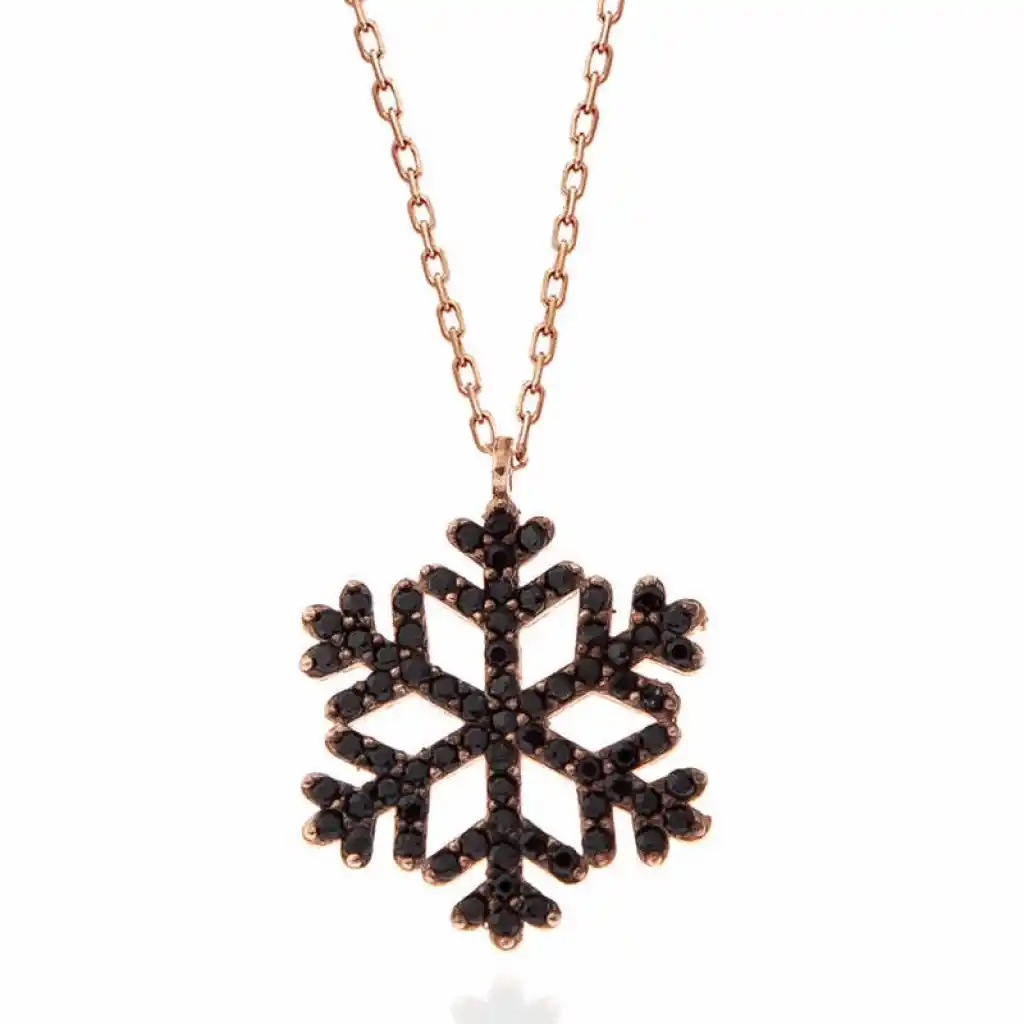 Her kar tanesinden aslında sadece bir tane var. Sevdiğiniz kişiye hediye ettiğiniz kar tanesi kolye ile onun sizin için eşsiz ve biricik olduğunu sessizce dillendirmiş oluyorsunuz. Sizlerde her zevke uygun gümüş kar tanesi kadın kolye modeli ile şıklığınıza ışıltı katın. Kar tanesi kadın kolye 925 ayar gümüşten imal edilmiştir. Gümüş üzerine rose kaplama yapılmıştır. Rose kaplama yapılan gümüş kadın kolye modelleri parlaklığını uzun süre muhafaza eder ve oksitlenmesi gecikir. Kolye üzerinde bulunan siyah taşlar zirkondur. Gümüş olan zincir boyu ortalama 45 cm"dir. Gümüş siyah taşlı kar tanesi kadın kolye modeli diğer kar tanesi kadın kolye modelleri gibi el emeği ile üretilmiştir. Gümüş ve değerli taşlar belirtilen nedeniyle ürün ağırlığında ± %10 sapma olabilmektedir.