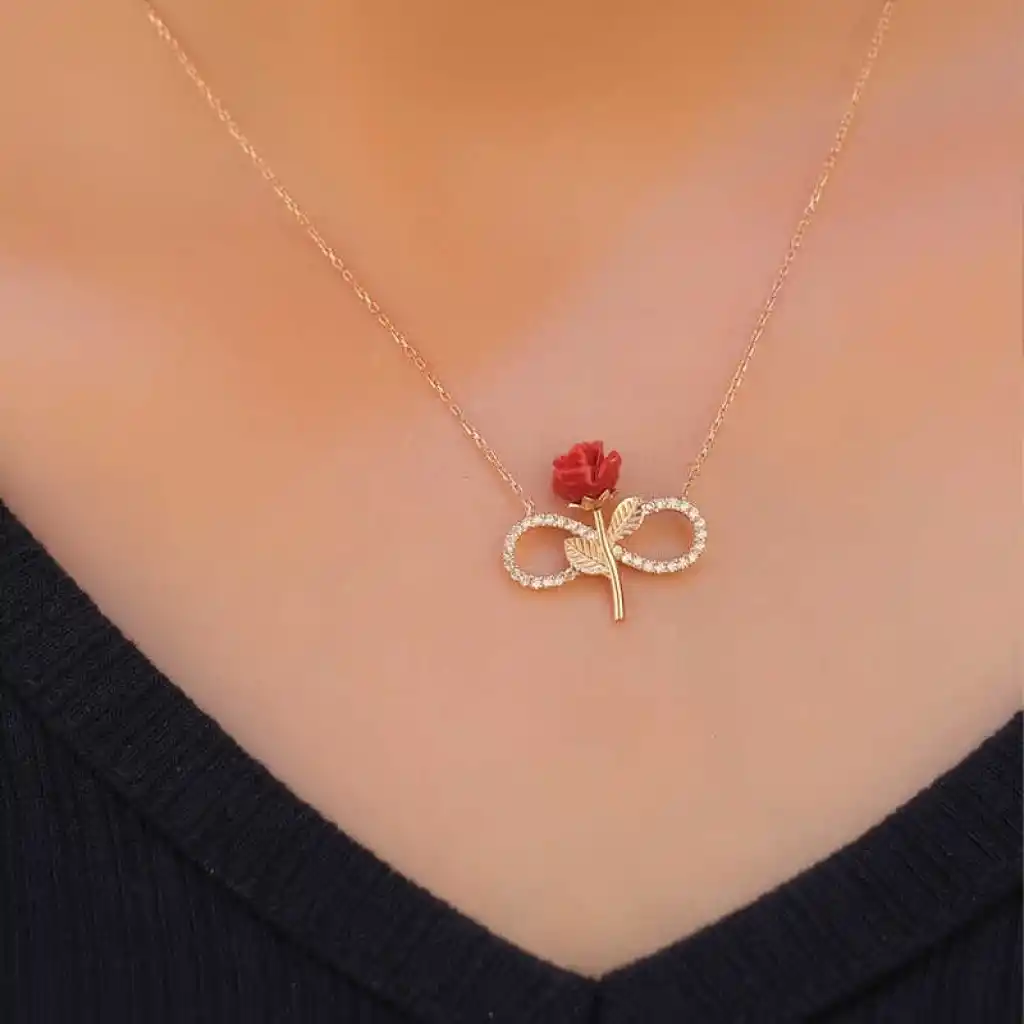 Sevdiklerinize eşi benzeri olmayan hediyeler almak ve onları sevindirmek istersiniz doğru yerdesiniz. Geniş ürün yelpazesi ve sıra dışı tasarımlara sahip en güzel hediye seçenekleri sizleri bekliyor. Sevgilinize sonsuz aşkı ifade etmenin en güzel, en anlamlı yollarından biri de tabikide sonsuzluk kolyesidir. Sonsuzluk üzerinde yer alan gül, sevgiliye atfedilmişdir. Sevgilinize hediye edeceğiniz bu özel kolye ile ona olan sonsuz aşkınızı, sevginizi ifade edebilir sonsuza kadar birlikte olacağınız mesajı verebilirsiniz. Gümüş üzerine rose kaplama yapılmıştır. Rose kaplama yapılan gümüş bayan kolye modelleri parlaklığını uzun süre muhafaza eder. Rose kaplama; ürüne pembe rengi verir ve oksitlenmesini geciktirir. Gümüş olan zincir boyu ortalama 45 cm"dir. Tüm gümüş bayan kolye modellerinde olduğu gibi gümüş sonsuz gül bayan kolye modeli de el emeği ile üretilmiştir. Gümüş ve değerli taşlar nedeniyle belirtilen ortalama ürün ağırlığında ± %10 sapma olabilmektedir.