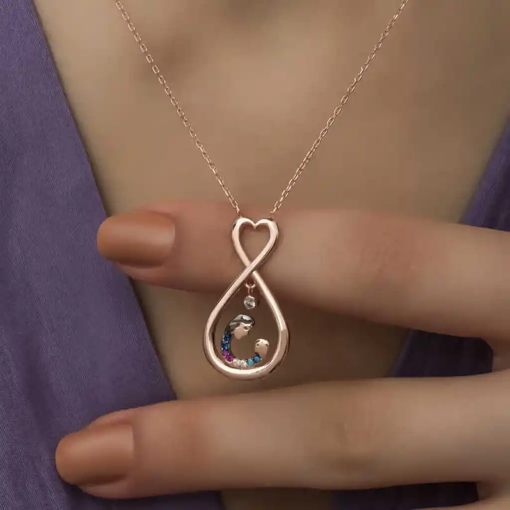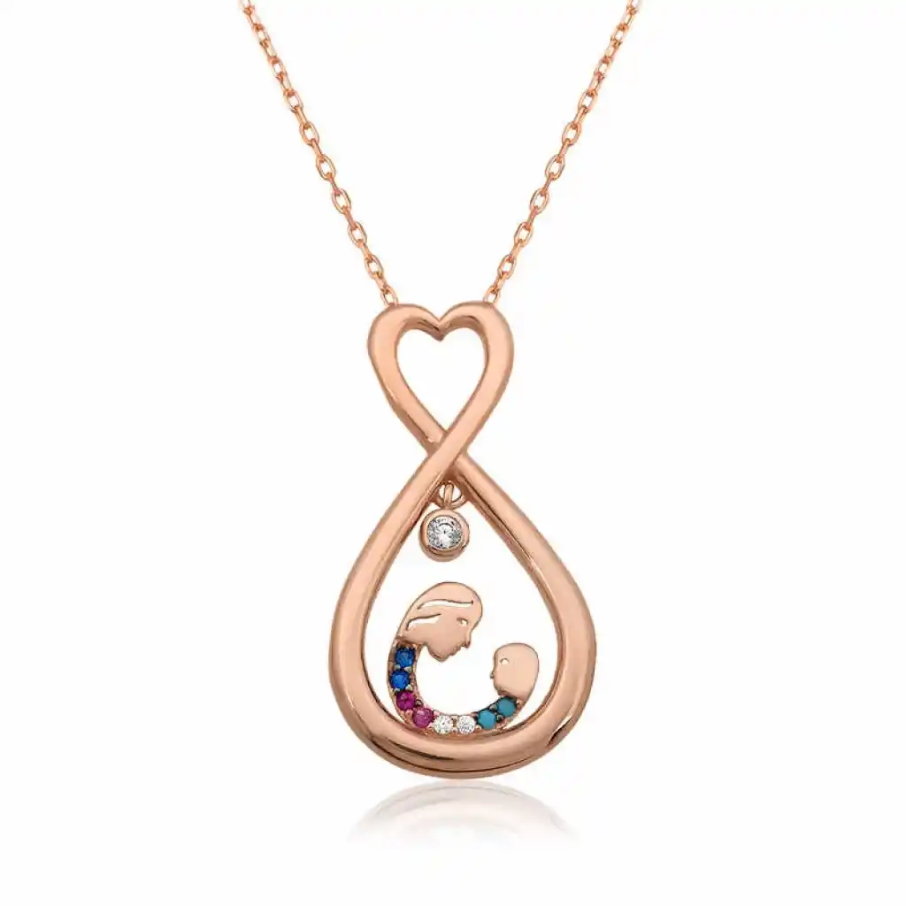 Çocuk ve anne arasındaki sevgiyi temsil eden özel bir tasarımdır. Annenize olan bağlılığınızı belirtmek için alabileceğiniz en uygun hediyelerden biri bu anne çocuk sevgisi kolye olacaktır. Anneniz için tasarlanan bu özel tasarım kalpli anne çocuk kolyesi 925 ayar gümüşten imal edilmiştir. Gümüş üzerine rose kaplama yapılmıştır. Rose kaplama yapılan gümüş anne çocuk kolye modelleri parlaklığını uzun süre muhafaza eder ve oksitlenmesi gecikir. Kolye üzerinde bulunan taşlar zirkondur. Gümüş olan zincir boyu ortalama 45 cm'dir. Gümüş sonsuz kalpli anne çocuk kolyesi el emeği ile üretilmiştir. Gümüş ve değerli taşlar nedeniyle belirtilen ortalama ürün ağırlığında ± %10 sapma olabilmektedir.