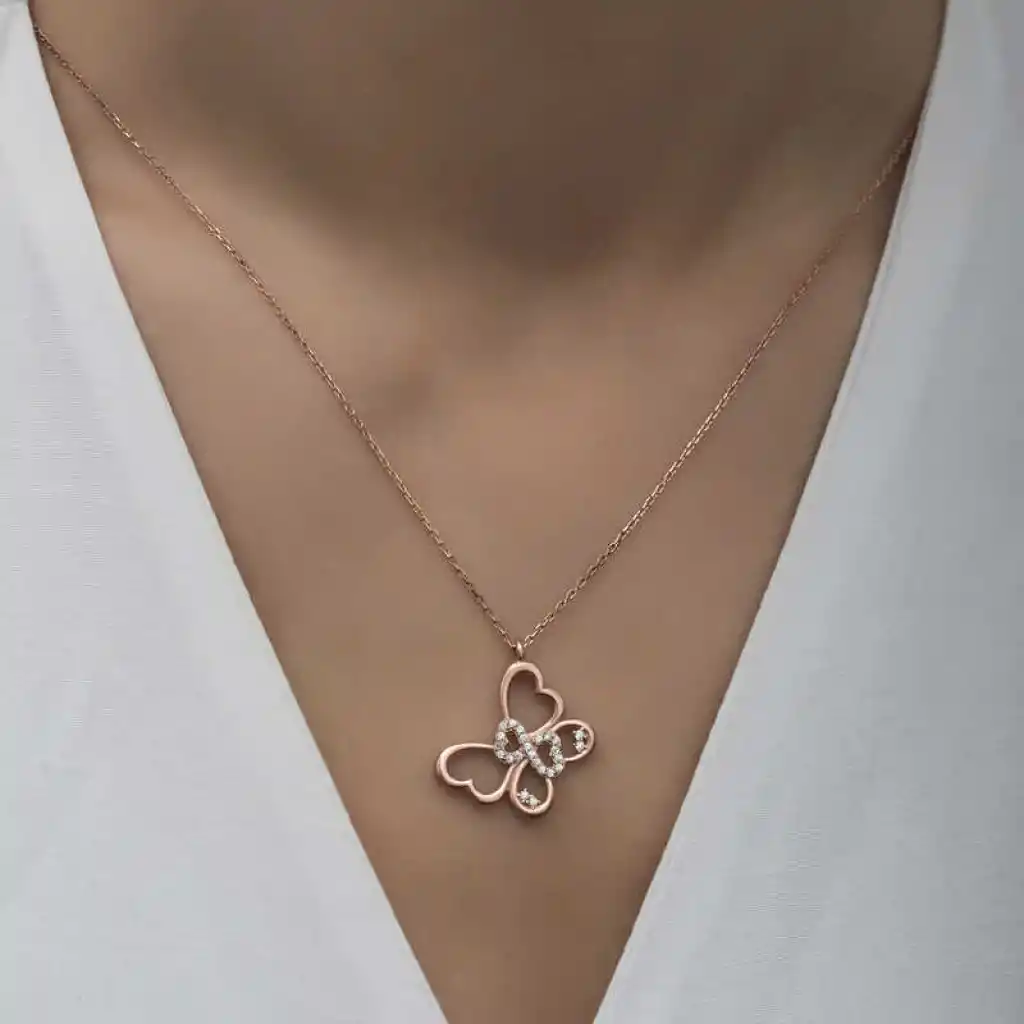 Kelebek kolye tertemiz sevginin ve aşkın ifadesidir. Sonsuz sevginizi sevdiğinize gösterebileceğiniz bir kolye modelidir. Sevdiklerinize alabileceğiniz anlamlı bir hediye bu şık kelebek kadın kolye 925 ayar gümüşten imal edilmiştir. Gümüş üzerine rose kaplama yapılmıştır. Rose kaplama yapılan gümüş kadın kolye modelleri parlaklığını uzun süre muhafaza eder ve oksitlenmesi gecikir. Kolye üzerinde bulunan beyaz taşlar zirkondur. Gümüş olan zincir boyu ortalama 45 cm"dir. Gümüş sonsuzluk kelebek kadın kolye modeli diğer tüm gümüş kadın kolye modellerinde olduğu gibi el emeği ile üretilmiştir. Gümüş ve değerli taşlar nedeniyle belirtilen ortalama ürün ağırlığında ± %10 sapma olabilmektedir.