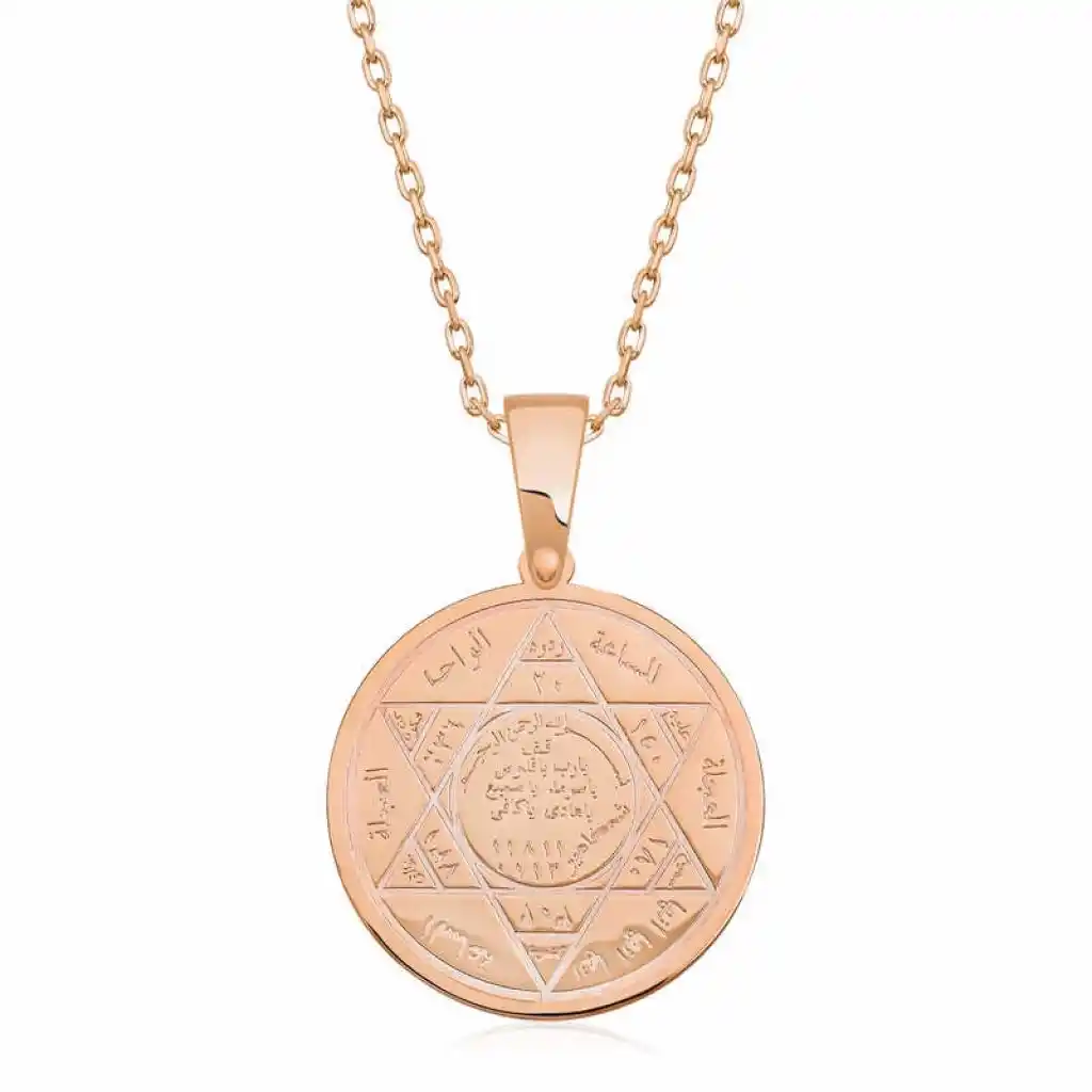 Davud yıldızı veya altı köşeli yıldız olarak da bilinen Süleyman mührünün hikmetlerini saymakla bitiremeyiz. Mührü yanında taşıyan kişiye büyü etki etmez. Kişiyi her türlü nazardan korunur. Taşıyan kişiye şeytan ve türevleri etki etmemesi gibi pek çok şifası vardır. Kolye 925 ayar gümüşten imal edilmiştir. Gümüş üzerine rose kaplama yapılmıştır. Rose kaplama yapılan gümüş kolyeler parlaklığını uzun süre muhafaza eder. Tüm gümüş bayan kolyelerde olduğu gibi gümüş Süleyman mührü kolye de el emeği ile üretilmiştir. Gümüş ve değerli taşlar nedeniyle belirtilen ortalama ürün ağırlığında ± %10 sapma olabilmektedir.